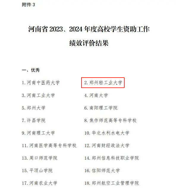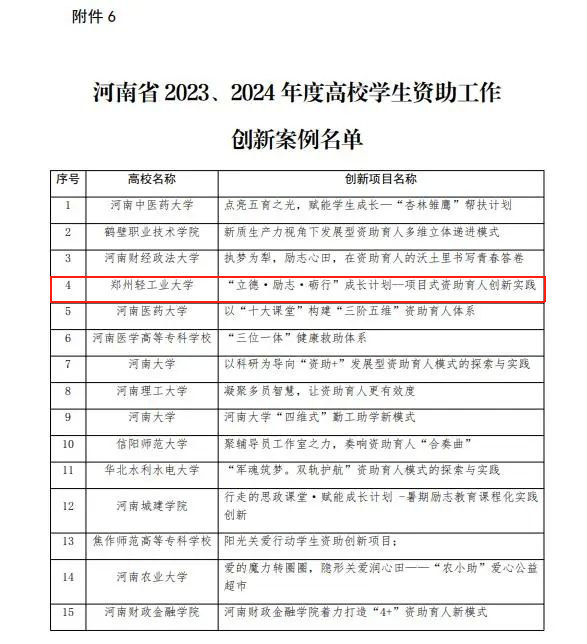 近日,河南省教育厅与国家开发银行河南省分行联合公布了全省高校2023、2024年度学生资助工作绩效评价结果,我校荣获“优秀”等次。同时,学校申报的资助工作案例《“立德·励志·砺行”成长计划--项目式资助育人创新实践》成功入选全省高校学生资助工作创新案例。