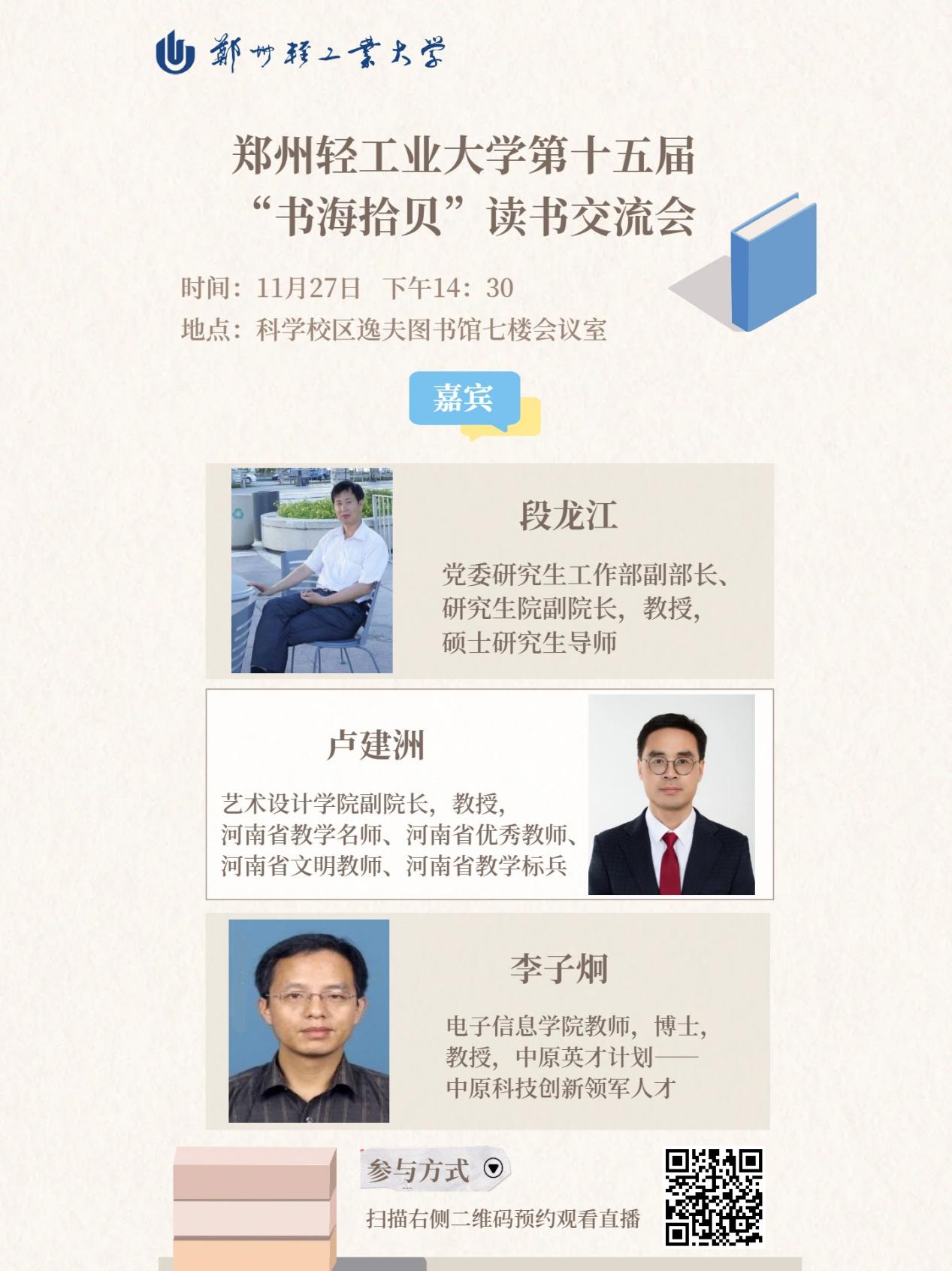 11月27日(周四)14:30,科学校区逸夫图书馆七楼会议室,让我们以书为桥,遇见志同道合的书友,在深度交流中拓宽格局,在真诚分享中奔赴成长。书海茫茫,拾贝有你!扫描下方二维码,预约直播,和我们一起在文字的世界里,解锁更多可能!