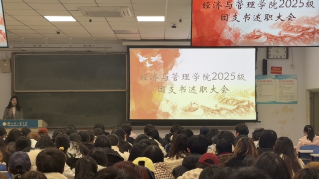 为深入学习贯彻习近平新时代中国特色社会主义思想,夯实基层团组织建设根基,检验各团支部年度工作成效,进一步提升基层团支部的凝聚力和执行力,经济与管理学院于12月23日至26日开展2025-2026年度团支部书记述职评议大会,参与此次活动的为2023级、2024级、2025级全体团支部书记、各班学生代表和各年级辅导员。
