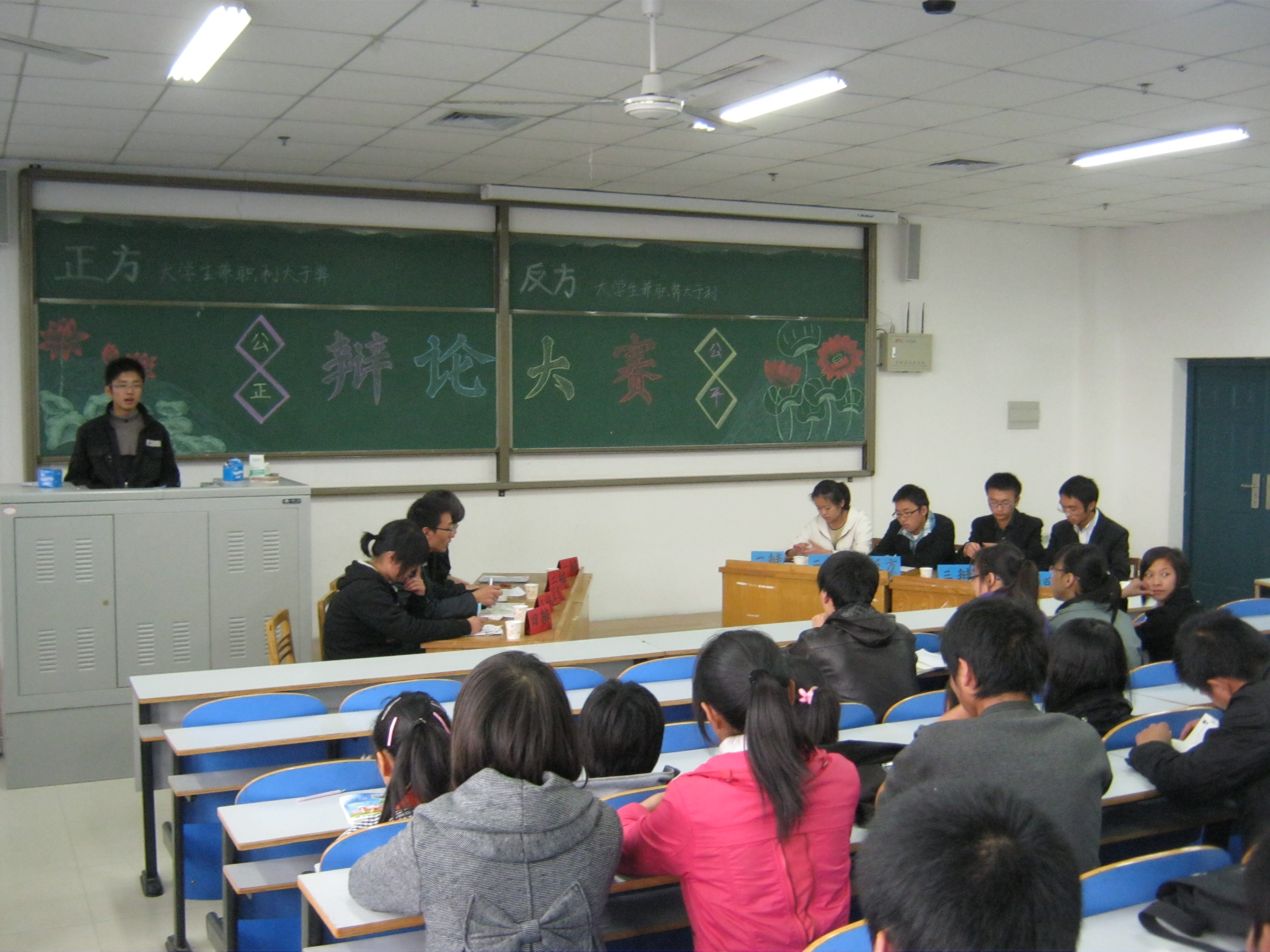 比赛中,正反双方以“大学生兼职利大于弊”还是“大学生兼职弊大于利”这一辩题展开激烈的辩论,辩手们各陈其词,时而引典,时而举事例,精彩的辩解赢得观众的阵阵喝彩。赛场上,同学们没有的初赛时的胆怯,紧张,个个满怀信心,斗志昂扬。观众席上的听众们被选手们犀利,睿智,幽默的语言及敏捷的思维所折服,不时地为辩手们出色的表现喝彩助威。最后,经过几位评委共同商议讨论,判定反方队应用化学10-1班获得冠军。