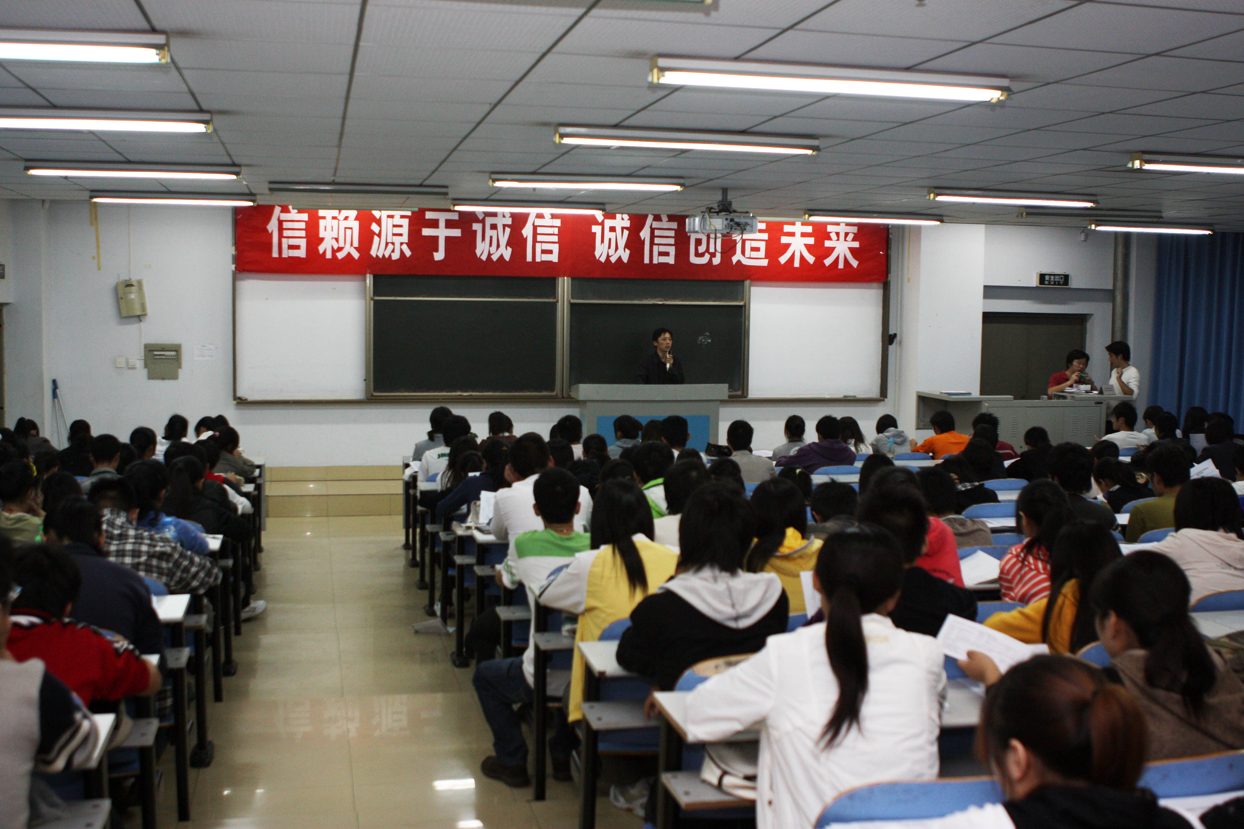 国际教育学院分别于2009年10月29日和10月30日晚7时在东风校区教三楼105教室及科学校区东塔707教室召开了以“信赖源于诚信,诚信创造未来”为主题的诚信贷款会议暨合同签约仪式。党总支副书记万顺国老师、分团委书记陶永钧老师、贷款负责人丁向育老师、以及2009年贷款的180名学生参加了会议。