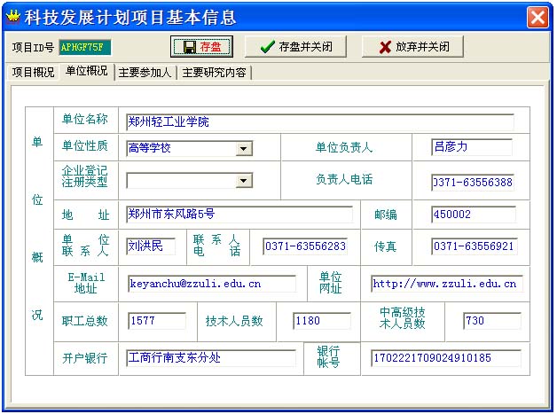在河南省科技计划项目申报系统录入过程中"单位概况"一栏统一填写如图所示。