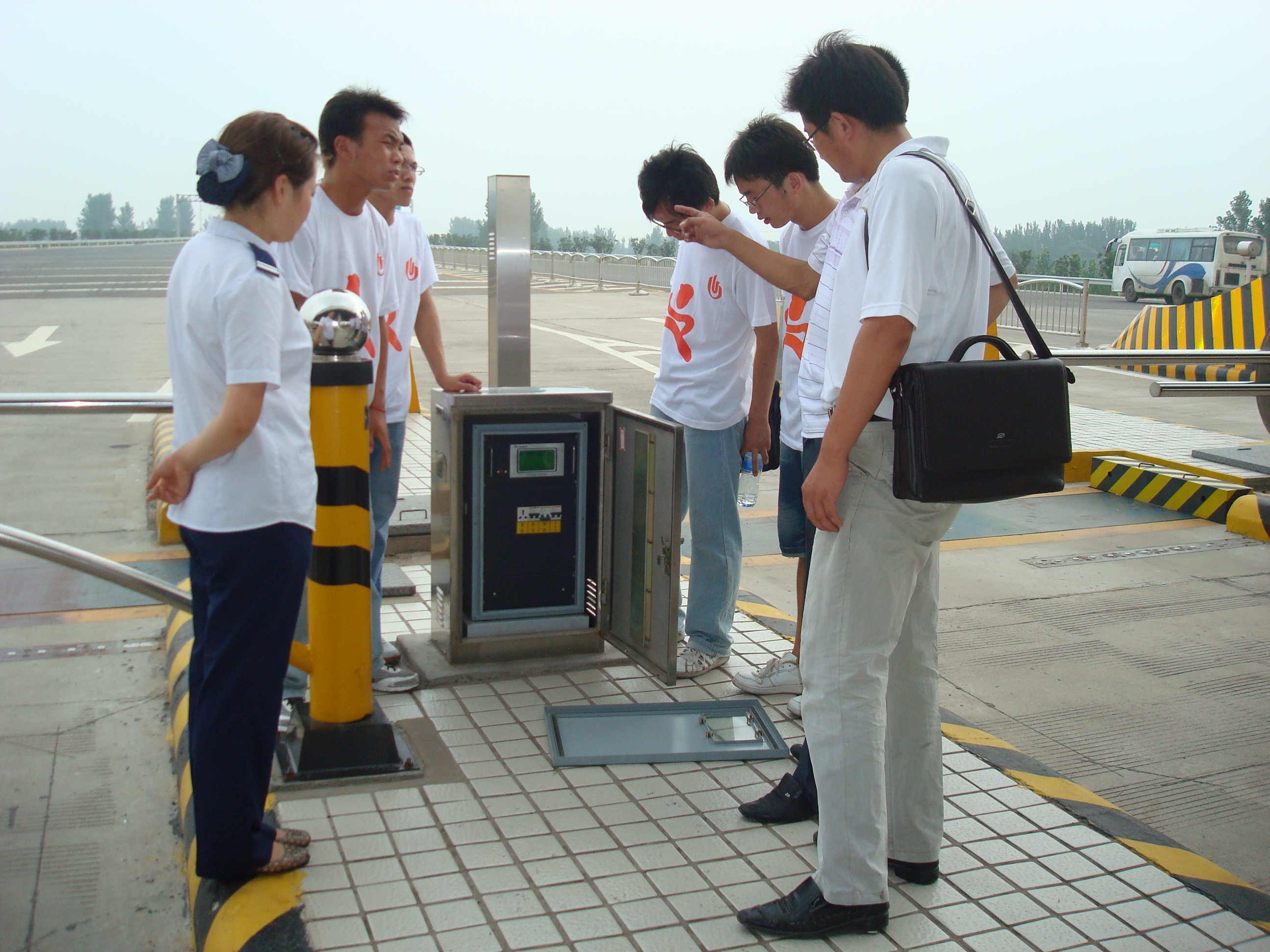 下午,小分队在该公司技术员韩存朝先生的陪同下,来到洛阳高速公路收费站参观学习。征得收费站领导的同意之后,韩技术员把检测设备一一打开向队员们介绍设备原理,并以现场车辆为对象,向队员们讲述采集信息的方式和过程,这令小分队成员们惊叹不已。一个不起眼的设备注入高科技后竟能发挥如此之功效,大大地开阔了大家的眼界,扩展了队员们的知识面。最后,暑期社会小分队和收费站领导合影留念,为第一天的活动画下了句号。