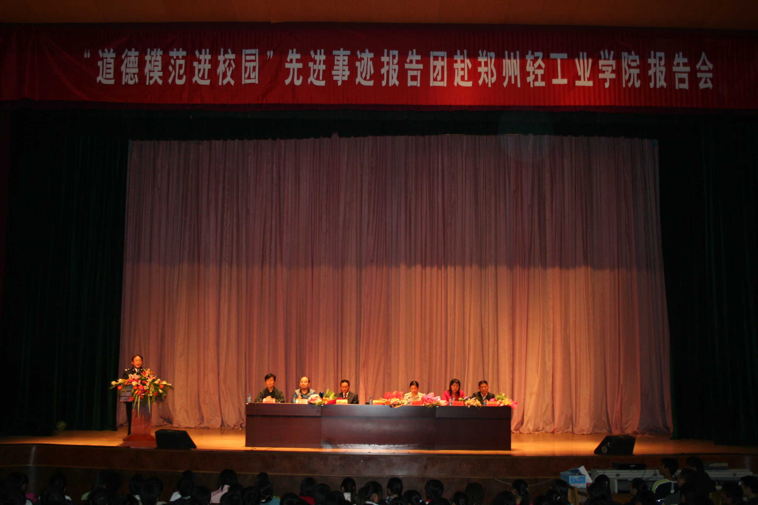 下午,由团省委、省学联组织的“道德模范进校园”先进事迹报告团一行5人,在团省委学校部曹克舜部长的带领下来到我校大礼堂,为我校千余名师生带来了一场感人至深的事迹报告,报告会中掌声此起彼伏、泪水纷洒。校党委书记林世选、校长剧乂文、党委副书记张胜利等领导会见了报告团成员。党委副书记张胜利在报告会上为报告团成员颁发了 “郑州轻工业学院德育讲师团教师、兼职辅导员”聘书,聘请他们为我校兼职思想政治辅导员。