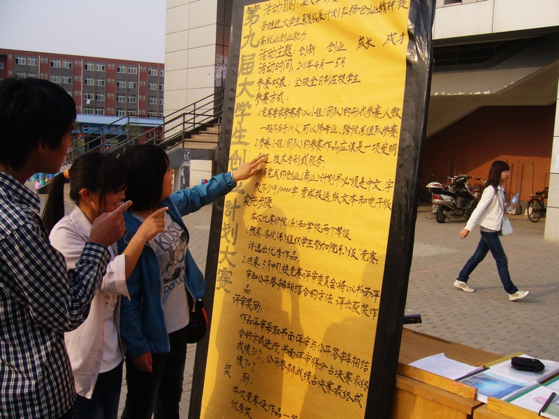 创业计划大赛是全国大学生“挑战杯”和我校科技文化艺术节系列活动之一,在全国高校和社会上有较大影响,我校在历年的河南省创业计划大赛中取得了骄人的成绩,获得了包括优秀组织奖、金、银、铜奖等多项奖项。为了让更多的同学了解此项赛事,激发同学们参与比赛,了解创业的积极性,食工学院分团委组织了本次展览。展览地点选在东风校区主干道旁和科学校区餐厅广场,展出的内容有往届优秀获奖作品、今年大赛的赛程安排与报名参赛方式等,我院还安排了往年获奖项目组成员与观展同学现场交流经验心得。展览吸引了许多过往同学驻足观看、咨询。