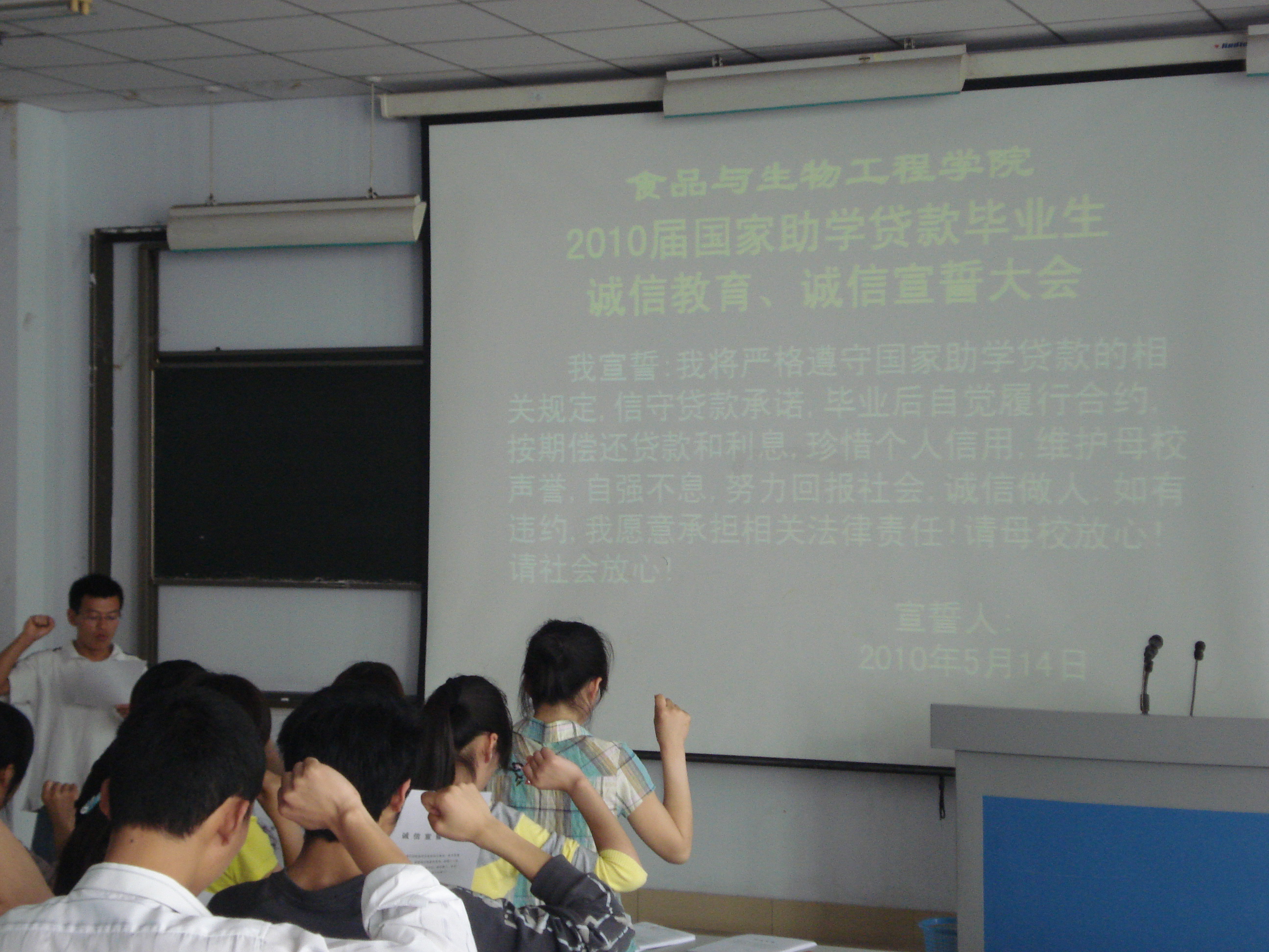 5月14日上午,食品与生物工程学院在教三楼303召开国家助学贷款毕业生诚信教育、诚信宣誓大会。党总支吴占超副书记、负责办理毕业生还款手续的袁杰老师和全体贷款毕业生参加了此次会议。