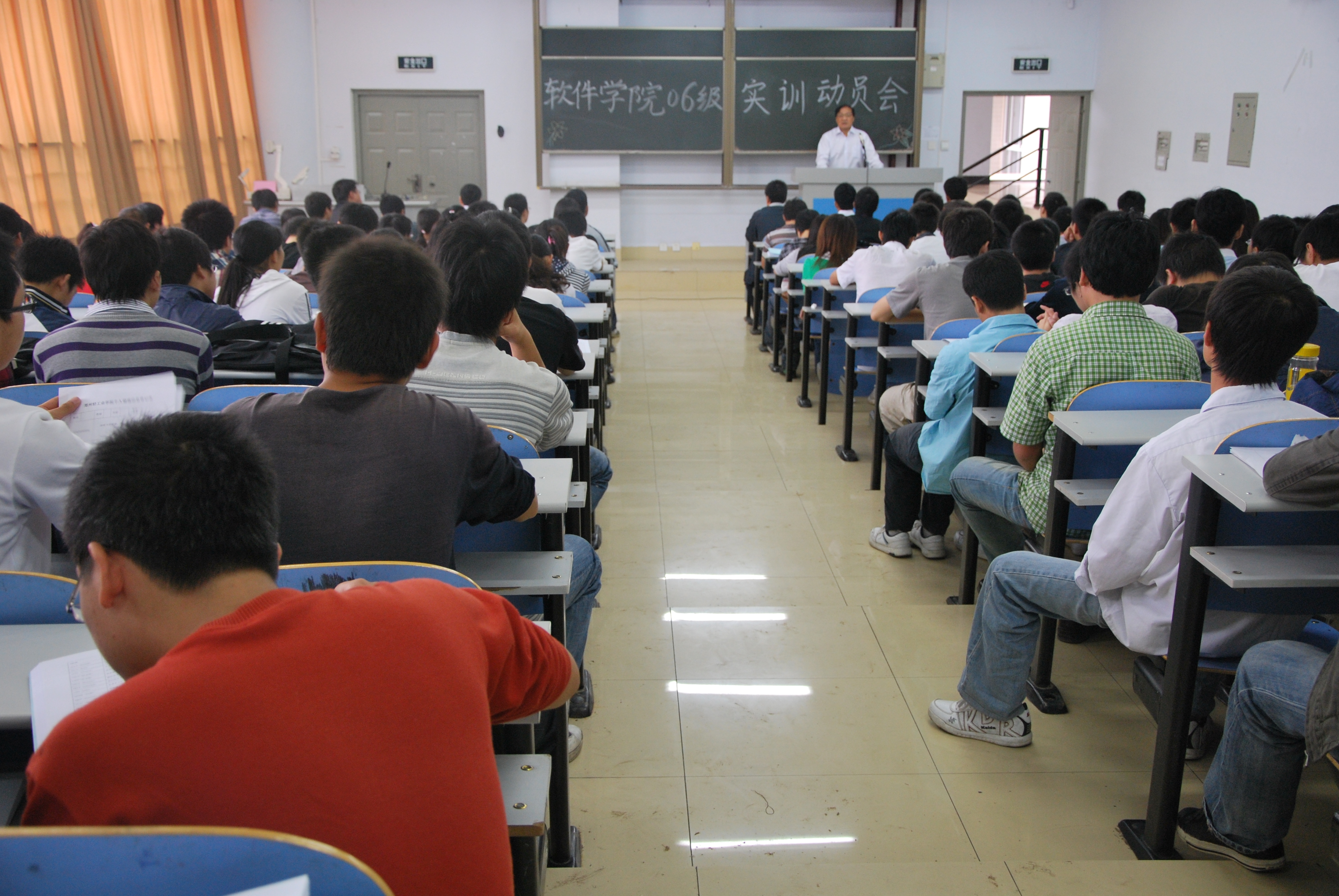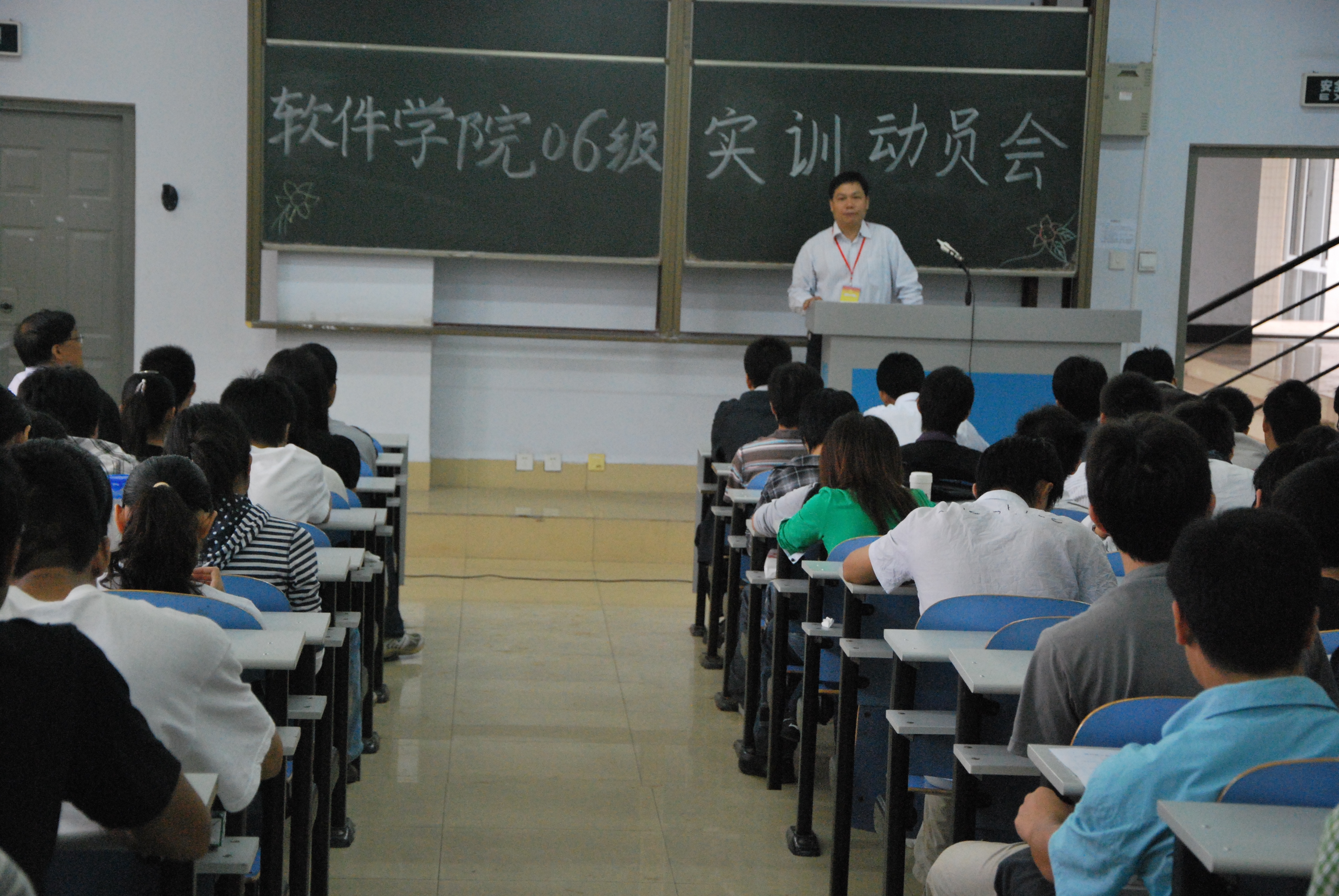 9月7日上午10点,软件学院在教三楼101室召开了全体06级本科网络工程、信息安全专业学生实训动员大会。计算机与通信工程学院(软件学院)党总支书记李学桥教授、院长甘勇教授及其他党政领导、实训中心主任、计算机系、网络工程系主任、实训公司经理参加了会议。