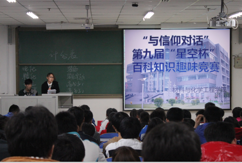 为了进一步学习贯彻党的十八大精神,增进同学们对党的知识的了解,激发广大团员青年学习十八大精神的积极性,2013年4月19日晚上7点,材料与化学工程学院在科学校区电教楼106成功举办了“与信仰对话”——星空杯百科知识竞赛。