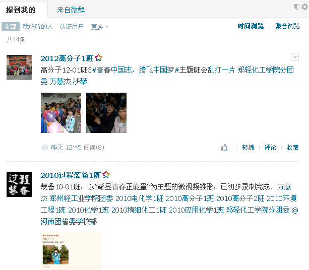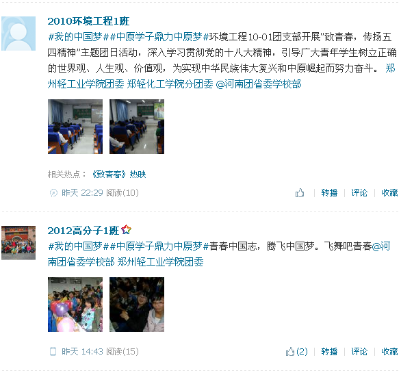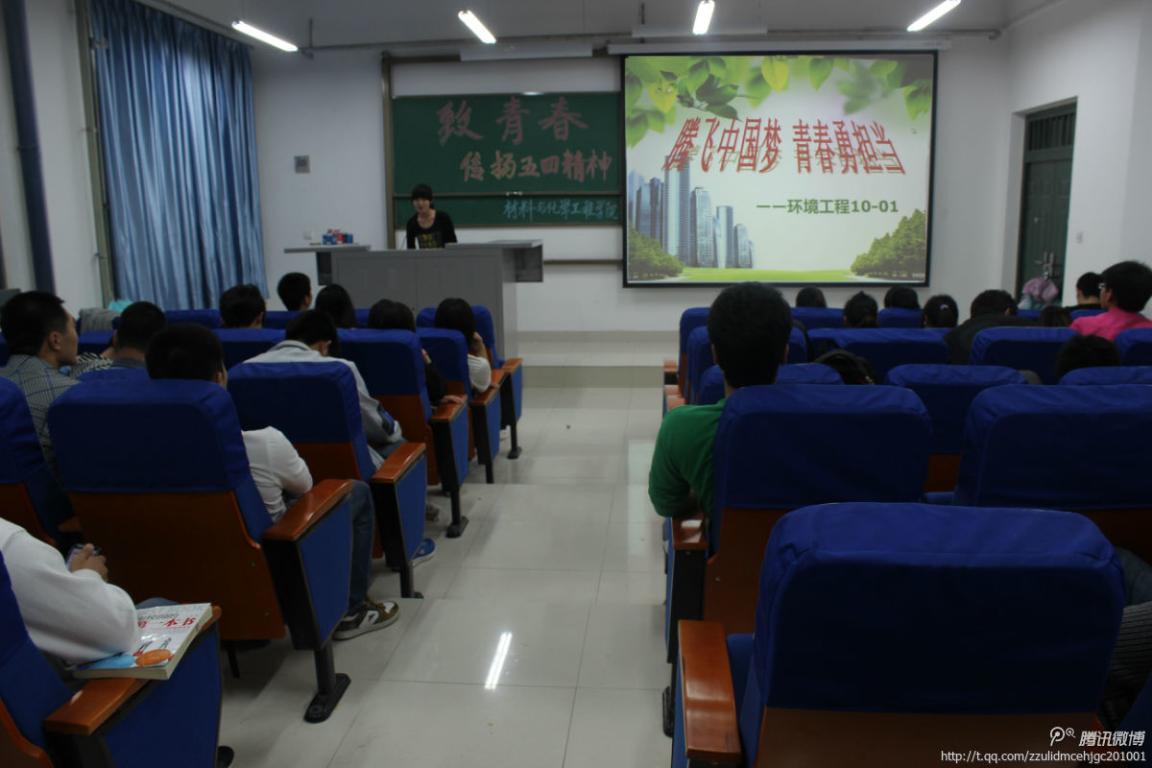 从4月中下旬开始,我院各团支部积极响应号召,通过座谈交流、主题演讲、励志歌曲传唱、励志电影展播、文艺表演等形式,发动青年学生表达对“什么是中国梦”、“如何实现中国梦”、“青年学生与中国梦的关系”的认识和理解,并利用腾讯微博进行展示交流。比如,过程装备10-1班录制了以“彰显青春正能量”为主题的微视频,环境工程10-1班在收看《致青春》之后展开热烈讨论,化学11-1班通过PPT生动展示了“中国梦”内涵和时代特征,过程装备12-1班围绕十八大和习近平总书记五四讲话内容开展了精彩的知识竞答,高分子12-1举办了“青春中国志,腾飞中国梦”文艺表演等。5月3日当天,我院广大团员青年积极登录腾讯网“校园百万团支部‘青春中国梦’线上主题团日”的专题空间参与各项线上活动,发表青春感言,传递青春梦想。