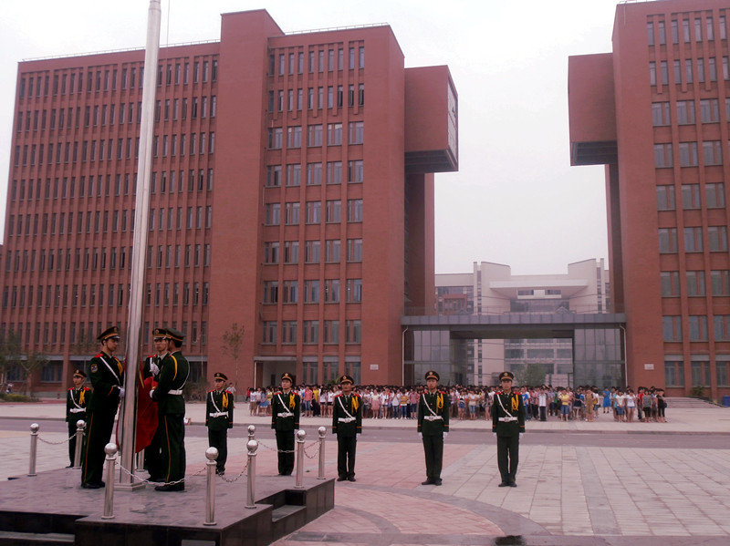 早上七点整,国旗班的旗手们迎着朝阳,踏着矫健的步伐,以饱满的热情,庄严地护卫五星红旗进场。国歌奏响,升国旗仪式开始,全体师生面向冉冉升起的五星红旗庄严地行注目礼。