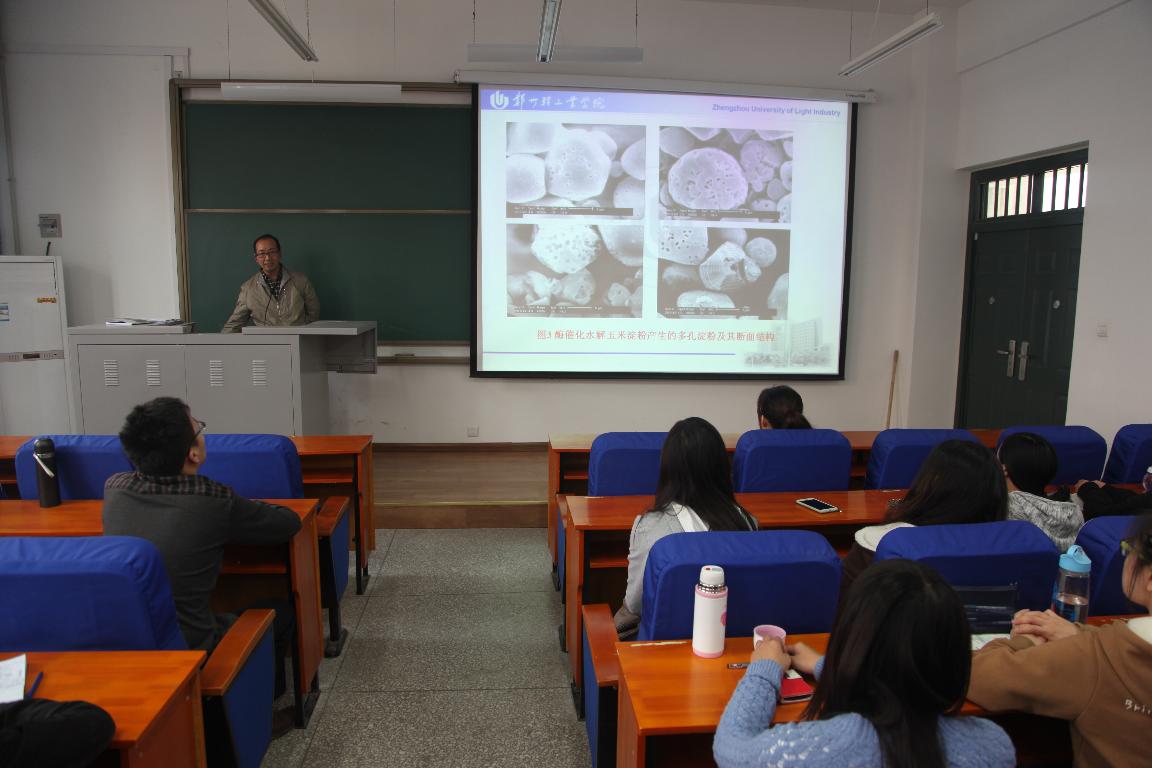 为促进和加强学术交流活动,更好的普及学科前沿知识,培养学生的兴趣,了解食品主要原料和化学成分——淀粉的结构、结晶结构特性知识,刘延奇教授于10月24日14:30在科学校区食工楼209教室为食品与生物工程学院的部分教师和全体硕士研究生做了“淀粉结晶结构研究进展”的学术报告。报告详细介绍了淀粉结晶结构研究的历史和重大进展事宜,对淀粉的B-型结晶结构、A-型结晶结构及V-型结晶结构的构建和相关性质进行了详细的介绍。与会的教师和学生不仅开拓了视野、丰富了相关基础知识。该学术报告的举行代表了食品与生物工程学院本学期开展的校内学术交流活动的正式启动。
