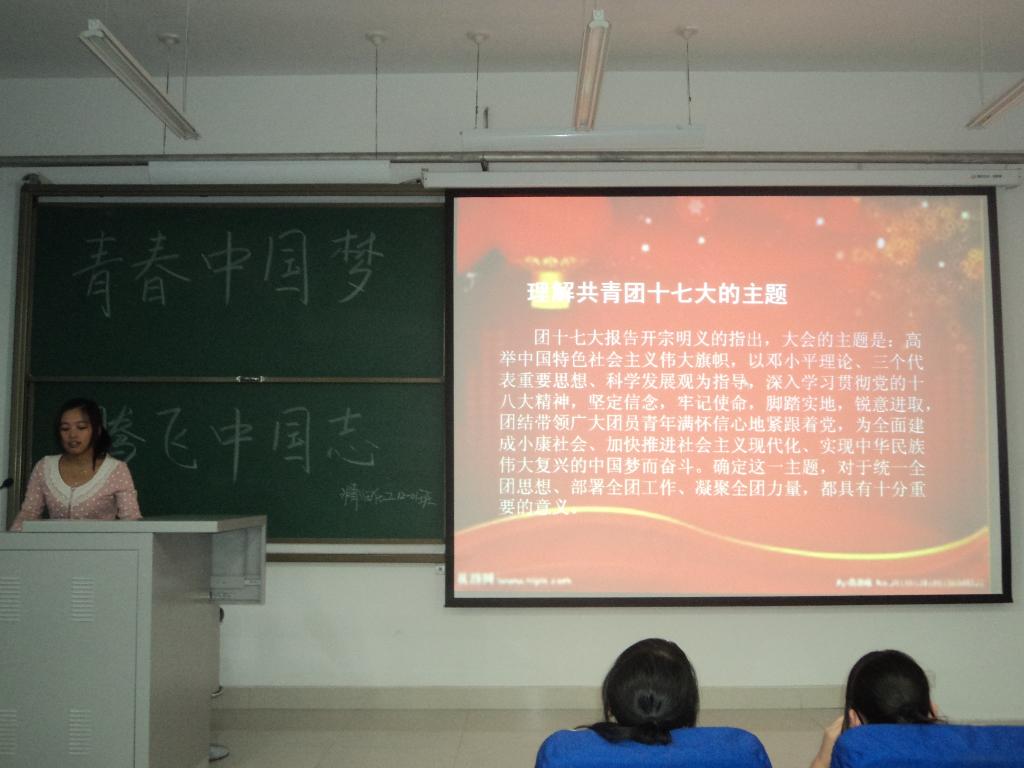 10月17日,精细化工2012级团支部在在科学校区化工楼218举办了“青春中国梦,腾飞中国志”的示范主题教育。活动中,主持人通过ppt向同学们生动介绍共青团十七大报告精神,此外还穿插“我们一同走过”大一生活视频记录、诗歌朗诵、红歌传唱等环节。同学们积极参与,畅谈梦想,在活动中对“中国梦”有了更深刻的理解和认识。