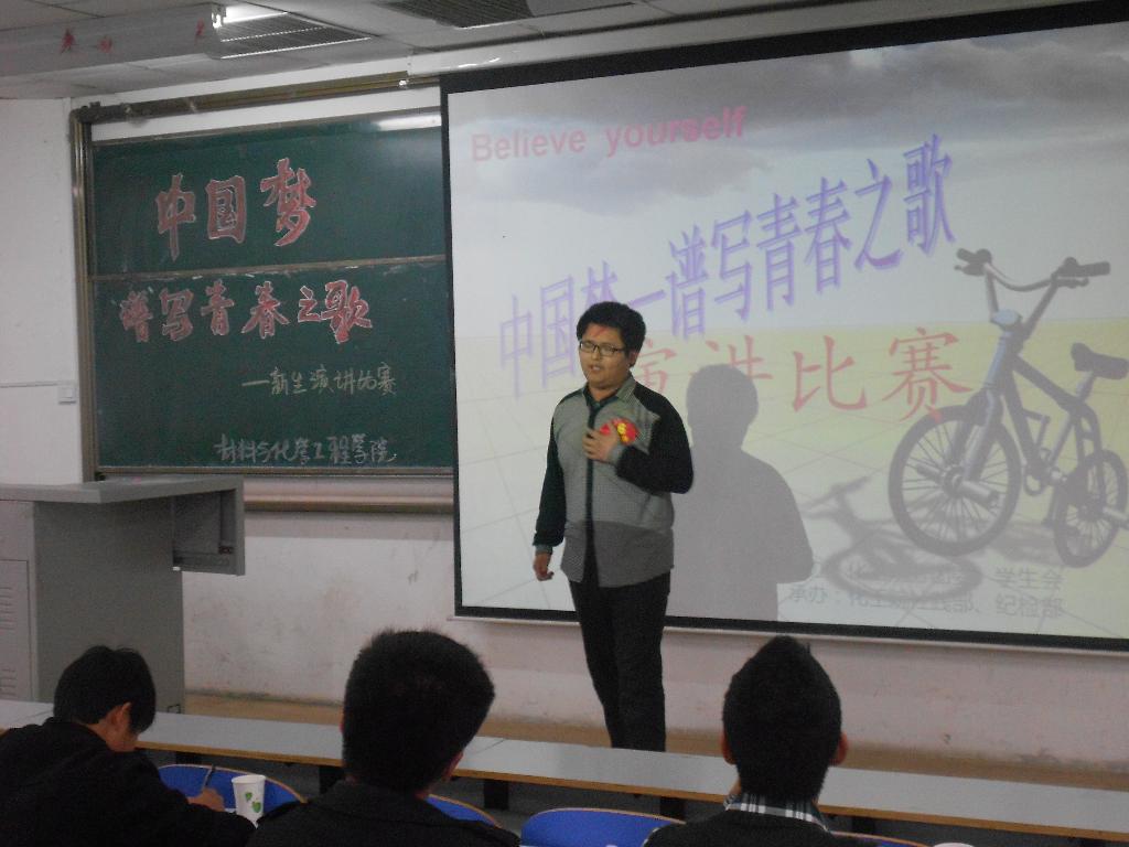 为纪念“一二•九”运动78周年,弘扬爱国精神,树立报国志向,活跃校园文化,展现青春风采,2013年11月14日,材料与化学工程学院在科学校区电教楼109举办了演讲比赛。