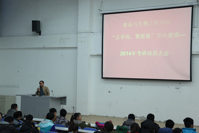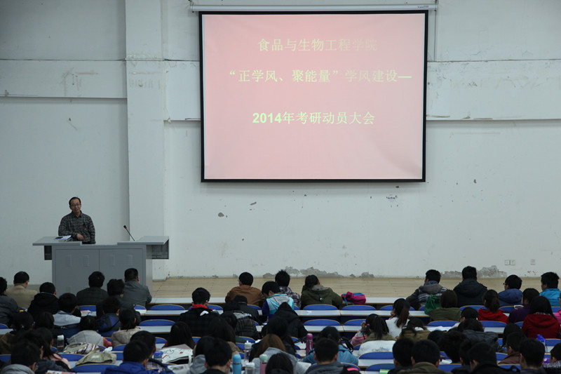 3月12日中午,食品与生物工程学院在科学校区三教楼408教室召开了“正学风、聚能量”学风建设—2014年考研动员大会。学院副院长刘延奇教授、纵伟教授、杨雪鹏博士、郭伍常老师出席会议并讲话,食工学院2011级辅导员老师及全体同学参加了此次会议。