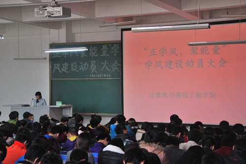 2014年3月13日中午,计算机与通信工程学院在软件楼118召开“正学风聚能量”学风建设动员大会。计算机与通信工程学院各班班委、学生代表及各学生组织学生干部参加大会,专兼职辅导员及部分教师代表到会。