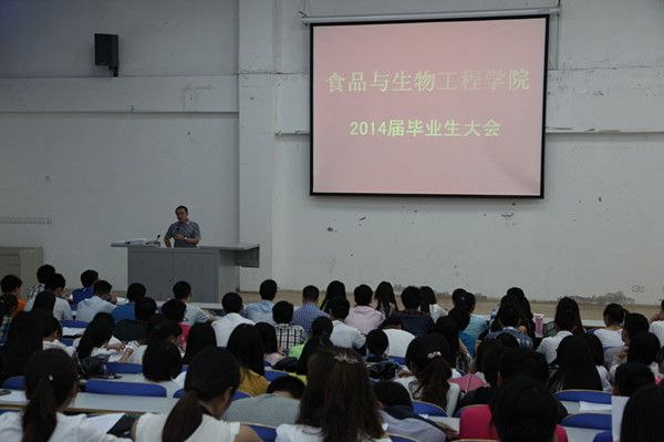 5月20日下午2点半,食品与生物工程学院在科学校区三教楼408教室召开了本科及研究生毕业生大会。学院党总支副书记郭伍常老师、毕业班辅导员、负责就业工作的老师以及全体2014届毕业生参加了大会。