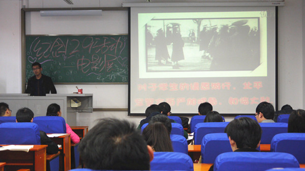 活动开始先由主持人讲解“一二•九”运动的历史背景:1935年12月9日,北平爱国学生举行了浩大的抗日救国示威游行,推动了抗日民族统一战线的建立,标志着中国人民抗日民主运动新高潮的到来。今天,在这个和平的年代,我院学生聚集教室观看红色爱国主义电影,体味历史,感受革命先辈的爱国热忱。同学们被生动的画面深深吸引住,不断感叹当时爱国青年的勇敢,认识到日本侵略者的罪恶行径,感受到中国人民的不屈精神,经历了一次爱国主义思想的陶冶和洗礼,从自己的内心深处迸发出了强烈的爱国情怀。