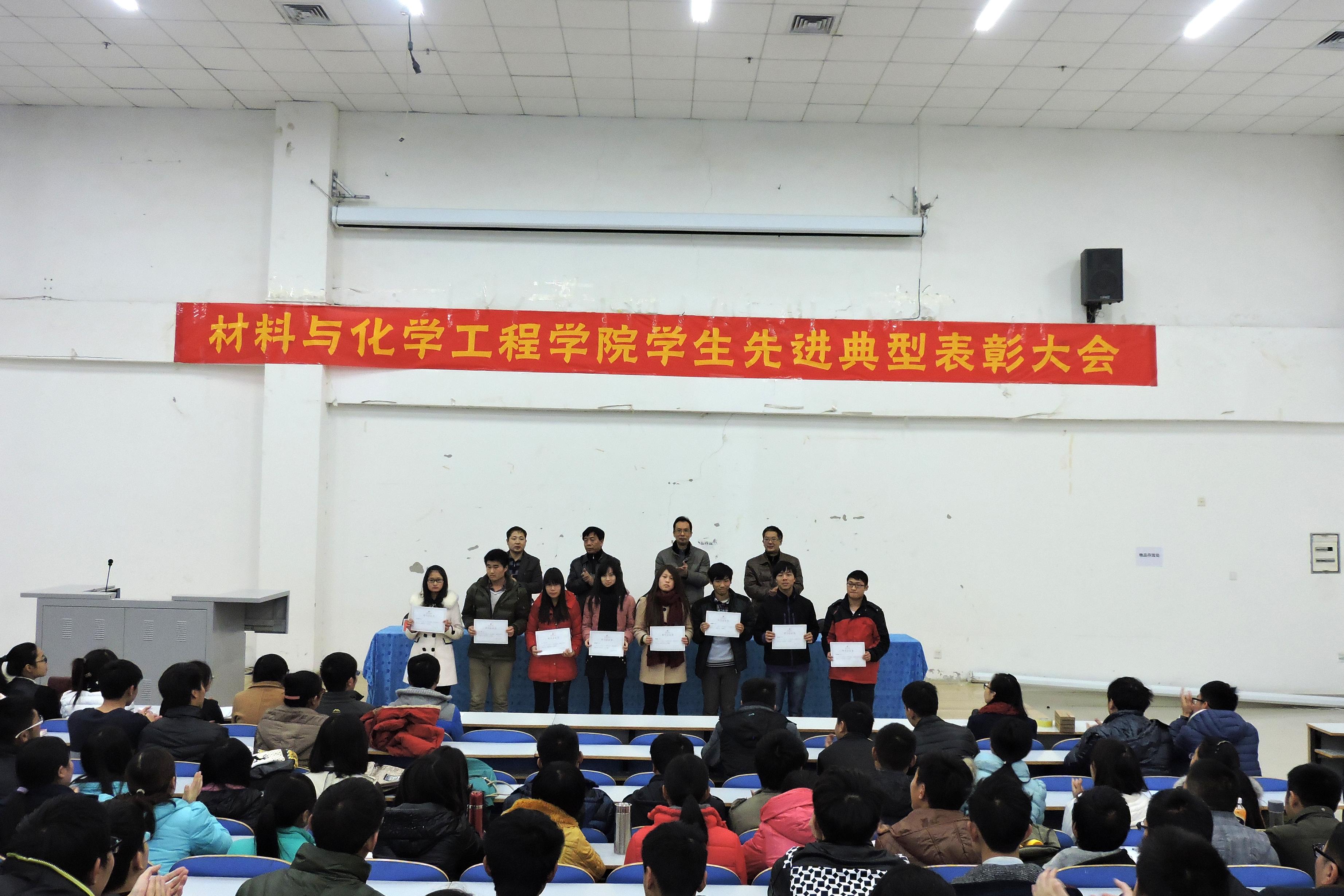 表彰大会在激昂的国歌声中开始。首先,副院长尹志刚教授宣读了学校表彰文件。在全体师生的共同努力下,材料与化学工程学院学生在2014年取得了优异的成绩,共获得十佳“轻院之星”1人;国家奖学金4人,国家励志奖学金62人;获得学科优秀奖和科技创新奖1人,综合学生奖学金228人;获得“三好学生”、 “优秀学生干部”、“社会工作先进个人”等称号255人;先进集体2个。与会院领导向获奖先进个人、先进集体代表颁发荣誉证书。获奖先进个人、先进集体代表先后发言,他们结合自己在学习、生活和社会工作中的体会,同与会学生分享了经验。