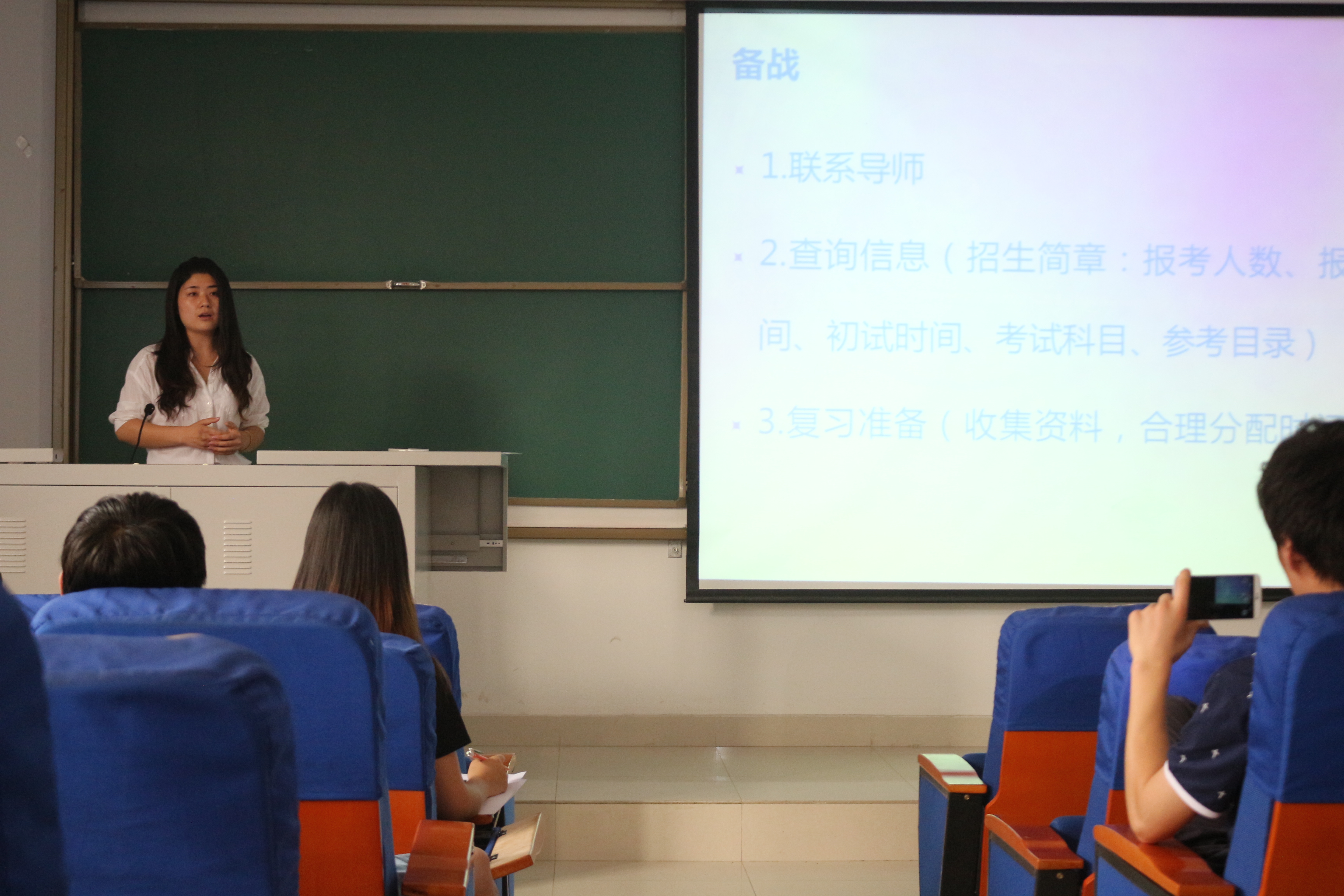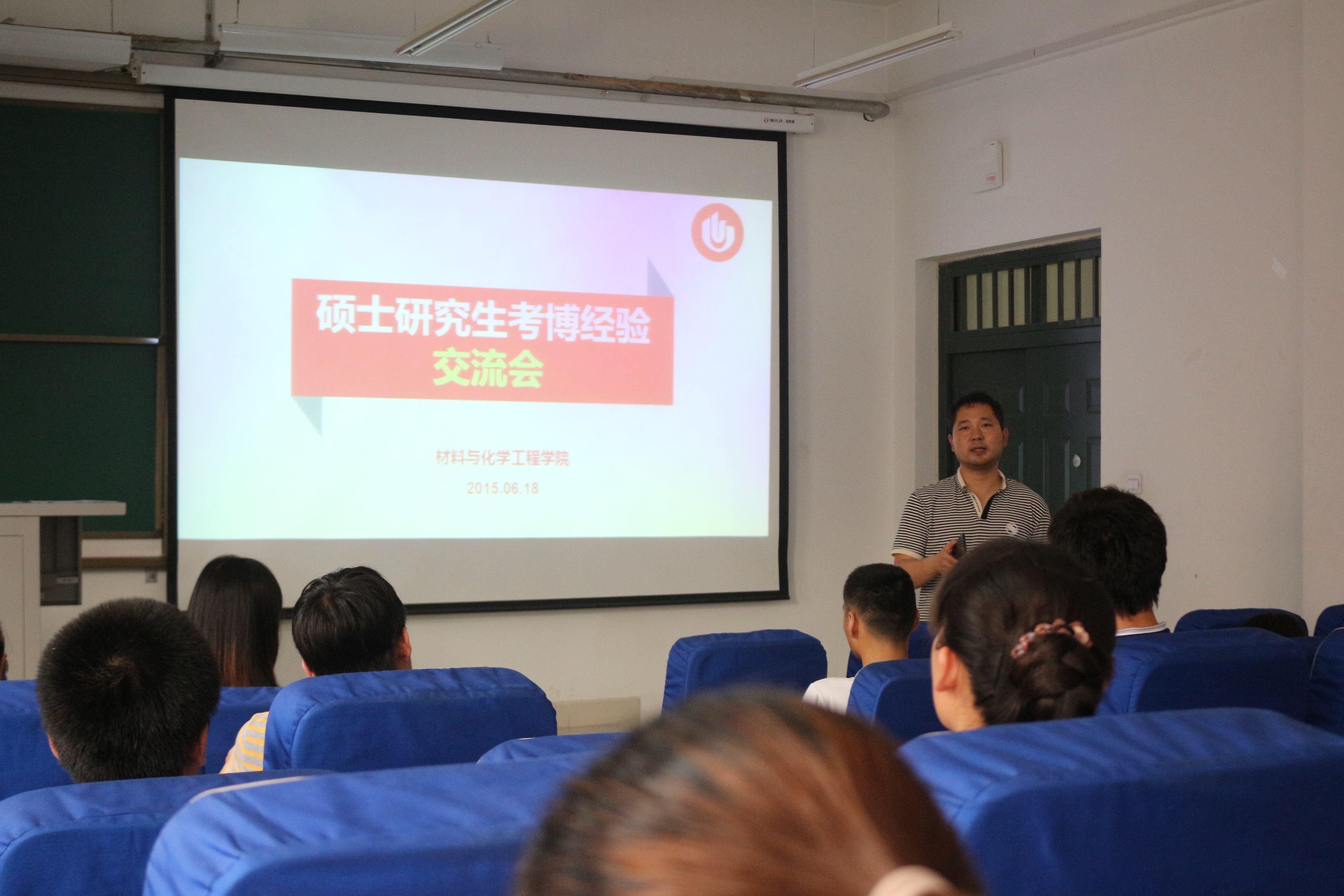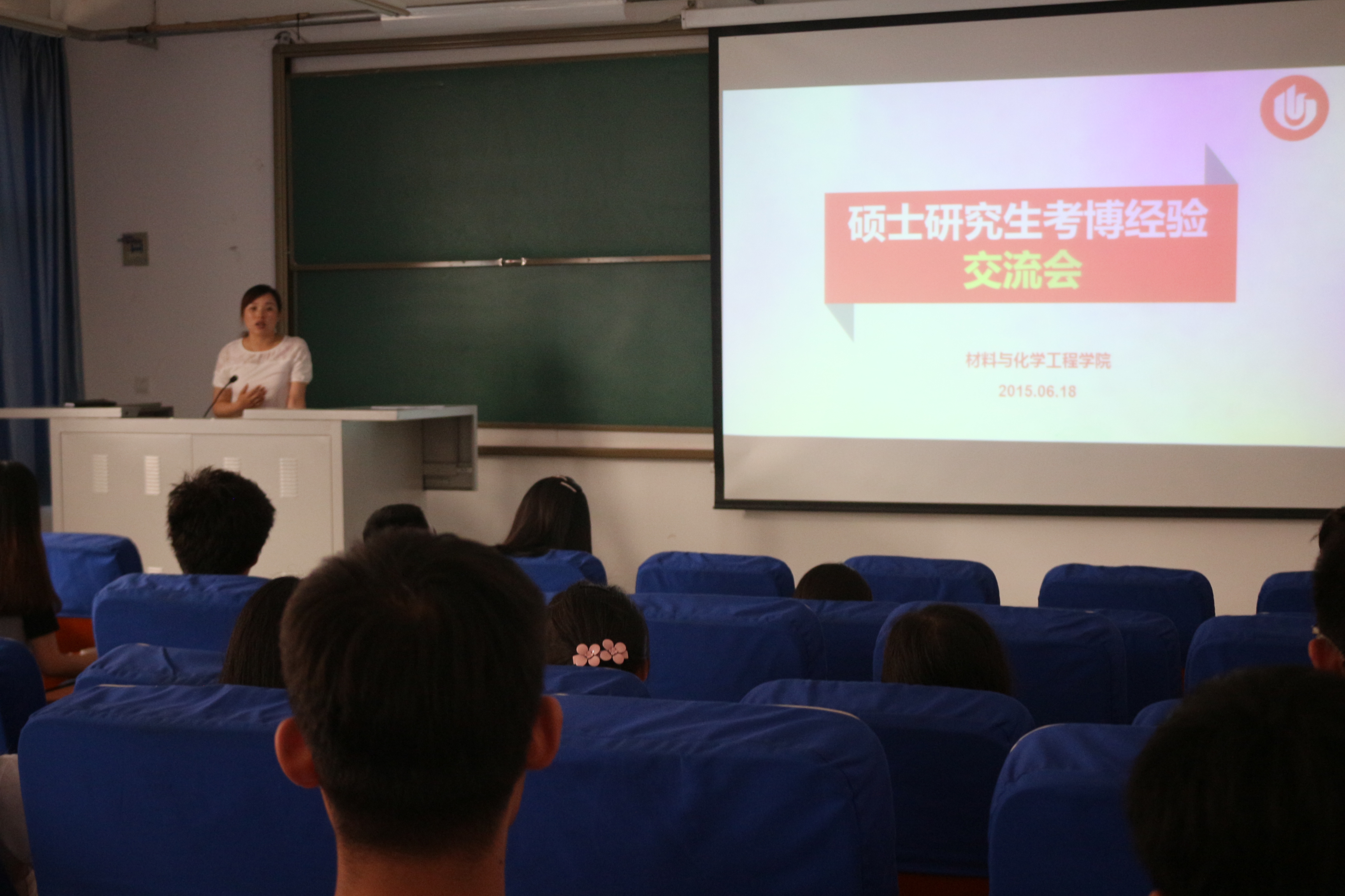 6月18日下午,材料与化学工程学院在化工楼218室举办了研究生考博经验交流会。已考取南京大学博士的2015届毕业生刘萌及我院青年教师代表杨清香博士、王诗文博士分别就个人的考博经历及博士期间的学习科研体会进行了交流。学院党总支宋德涛副书记、研究生辅导员老师及全体研究生参加了会议。