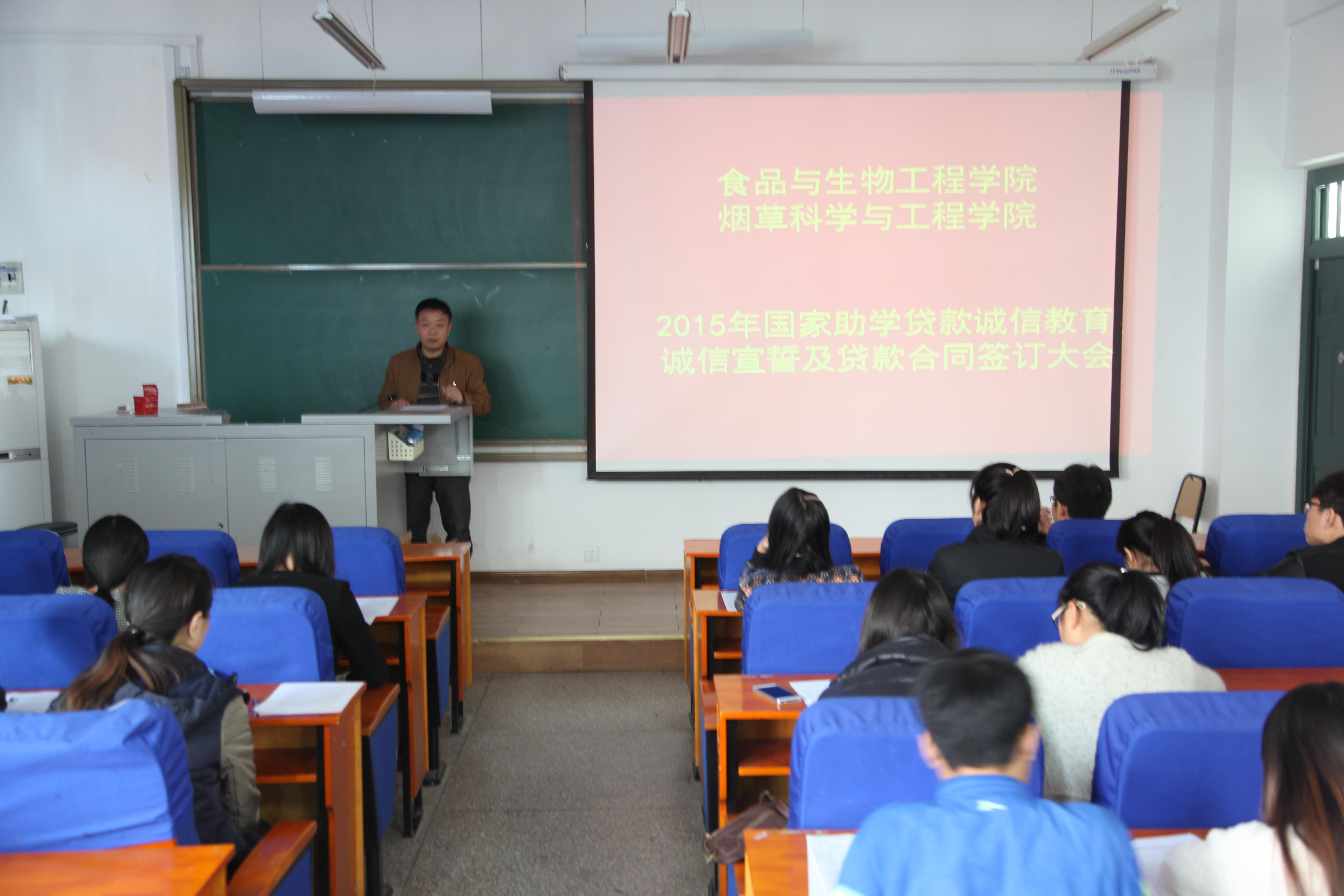 为保证国家助学贷款工作顺利开展,加强学生的诚信教育,提高贷款学生对国家助学贷款的政策认识,2015年10月30日,食品与生物工程学院在食工楼209教室举行了2015年度国家助学贷款合同签订暨诚信教育大会。学院负责学生贷款工作的老师及全体贷款学生参加了此次会议。