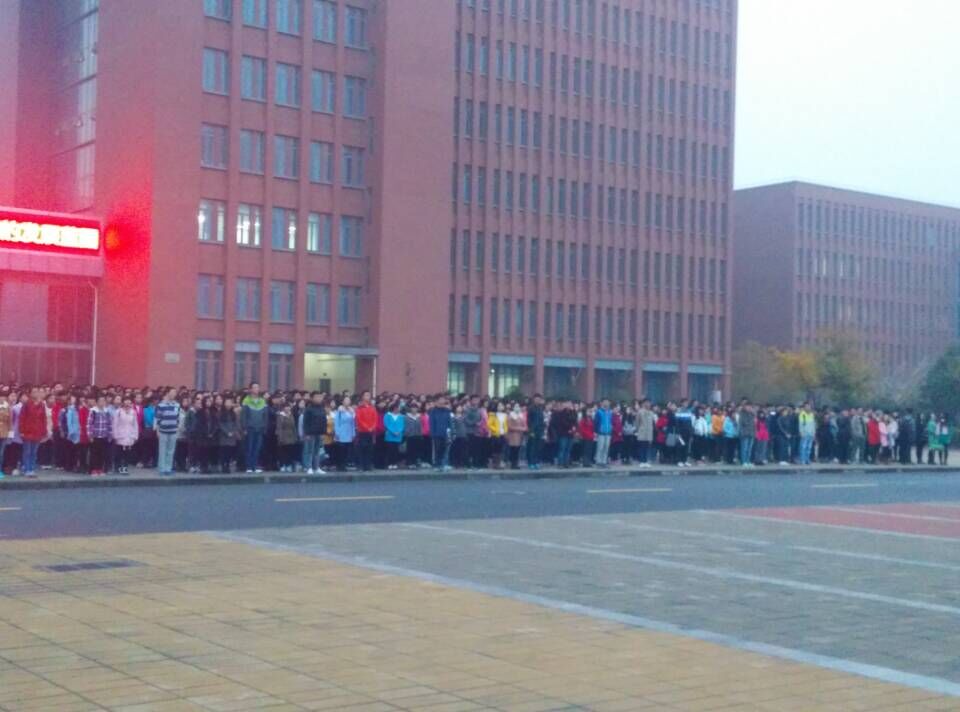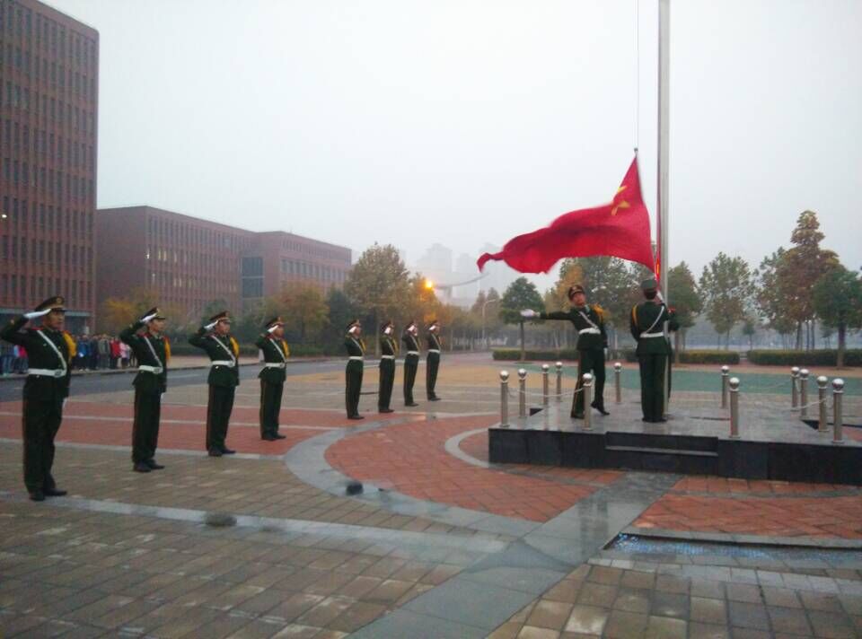 升旗仪式伴随着朝阳的升起在7:00准时开始。2013级代表周彦培同学进行了题为“弘扬爱国精神 担当青春使命”的主题演讲。演讲中提到习近平总书记的一句话:“功崇惟志,业广唯勤”,告诉我们要树立坚定而明确的目标和远大的志向,把目标作为自己前进的指明灯与动力。国旗护卫队踏着矫健的步伐,庄严地护着国旗入场。鲜艳的五星红旗冉冉升起,同学们敬礼注目,亢奋人心的《义勇军进行曲》回荡在整个校园。