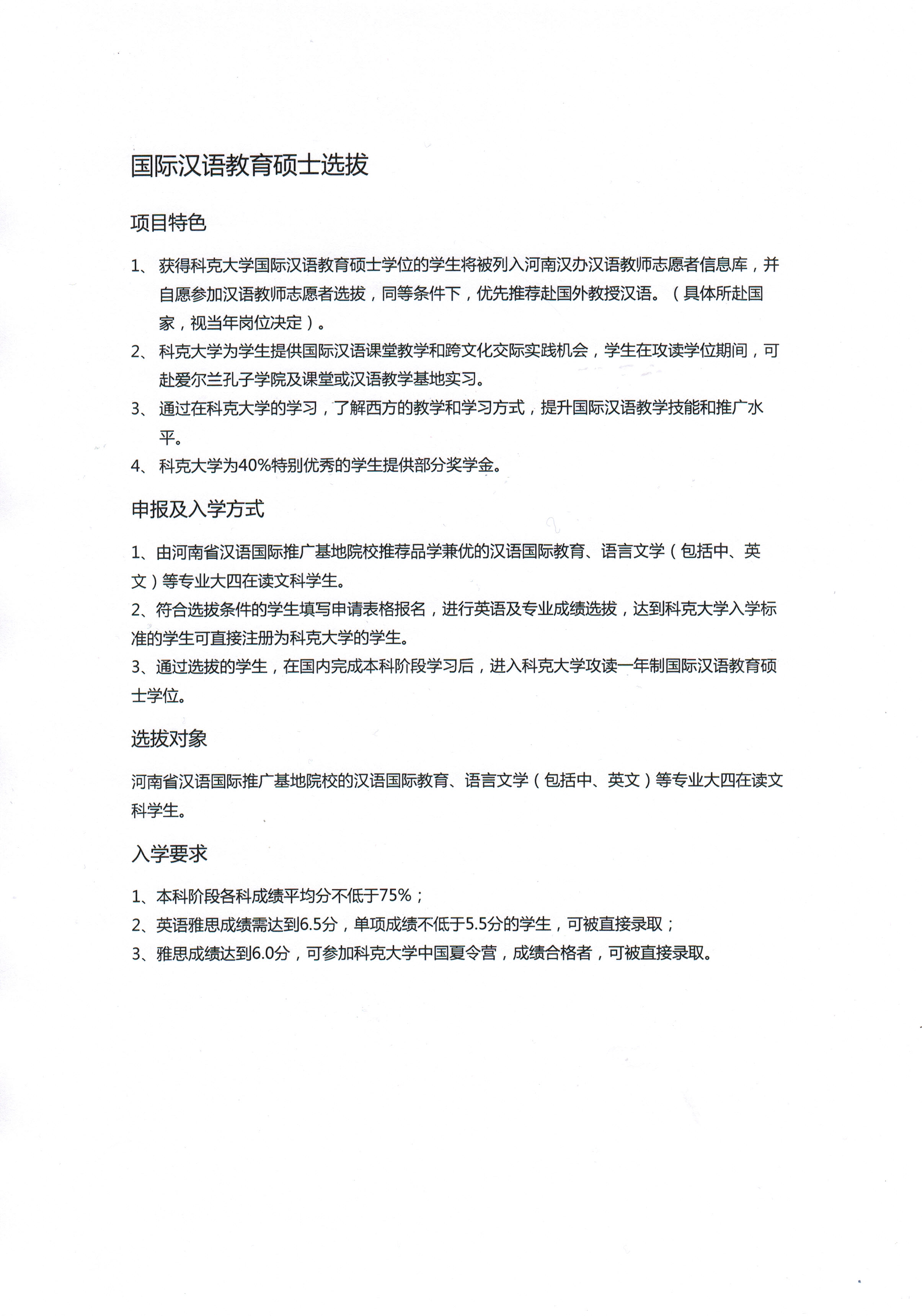 1.获得科克大学国际汉语教育硕士学位的学生将被列入我办汉语教师志愿者信息库,在自愿参加汉语教师志愿者选拔中,与其他候选人同等条件下,优先推荐赴国外教授汉语;
