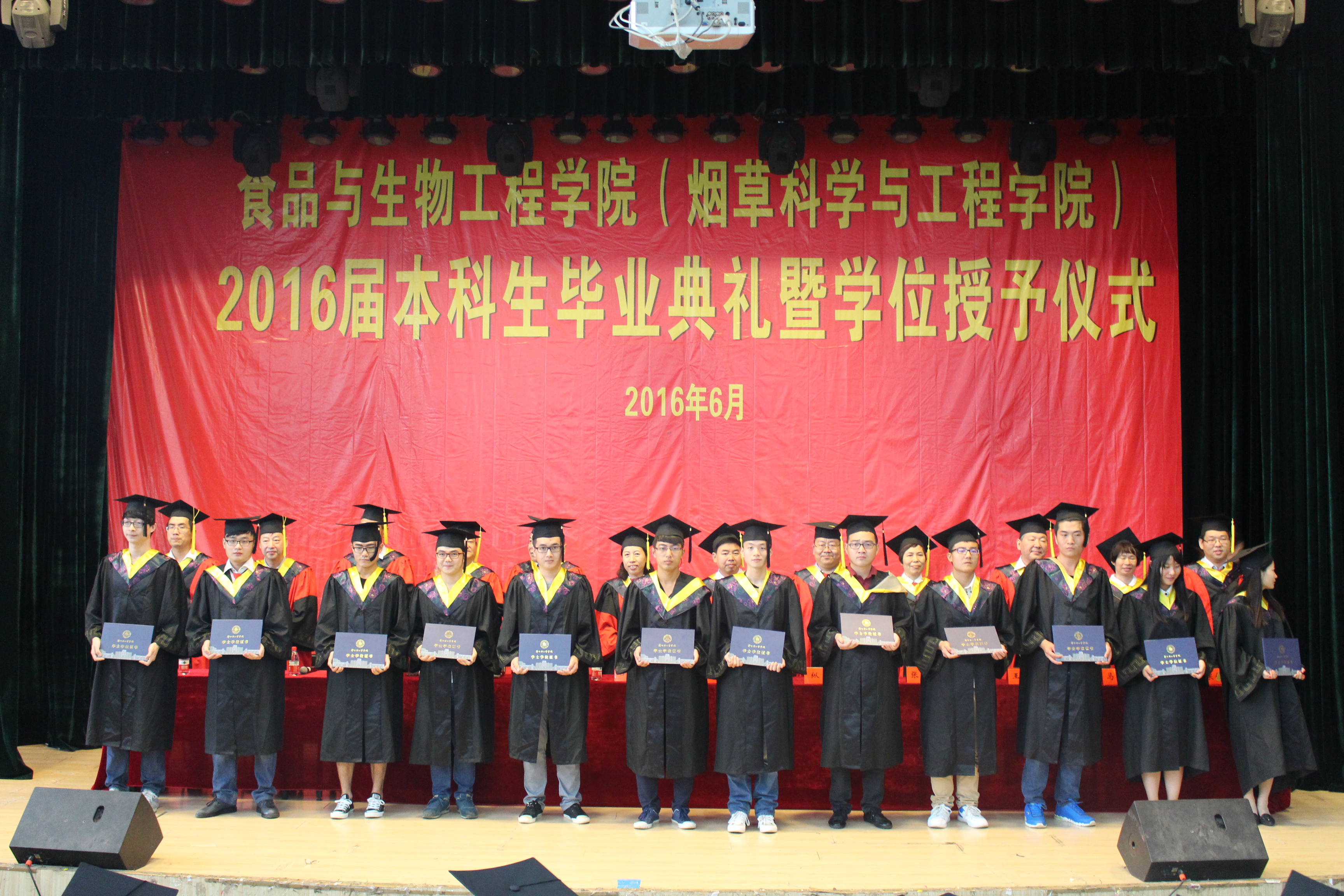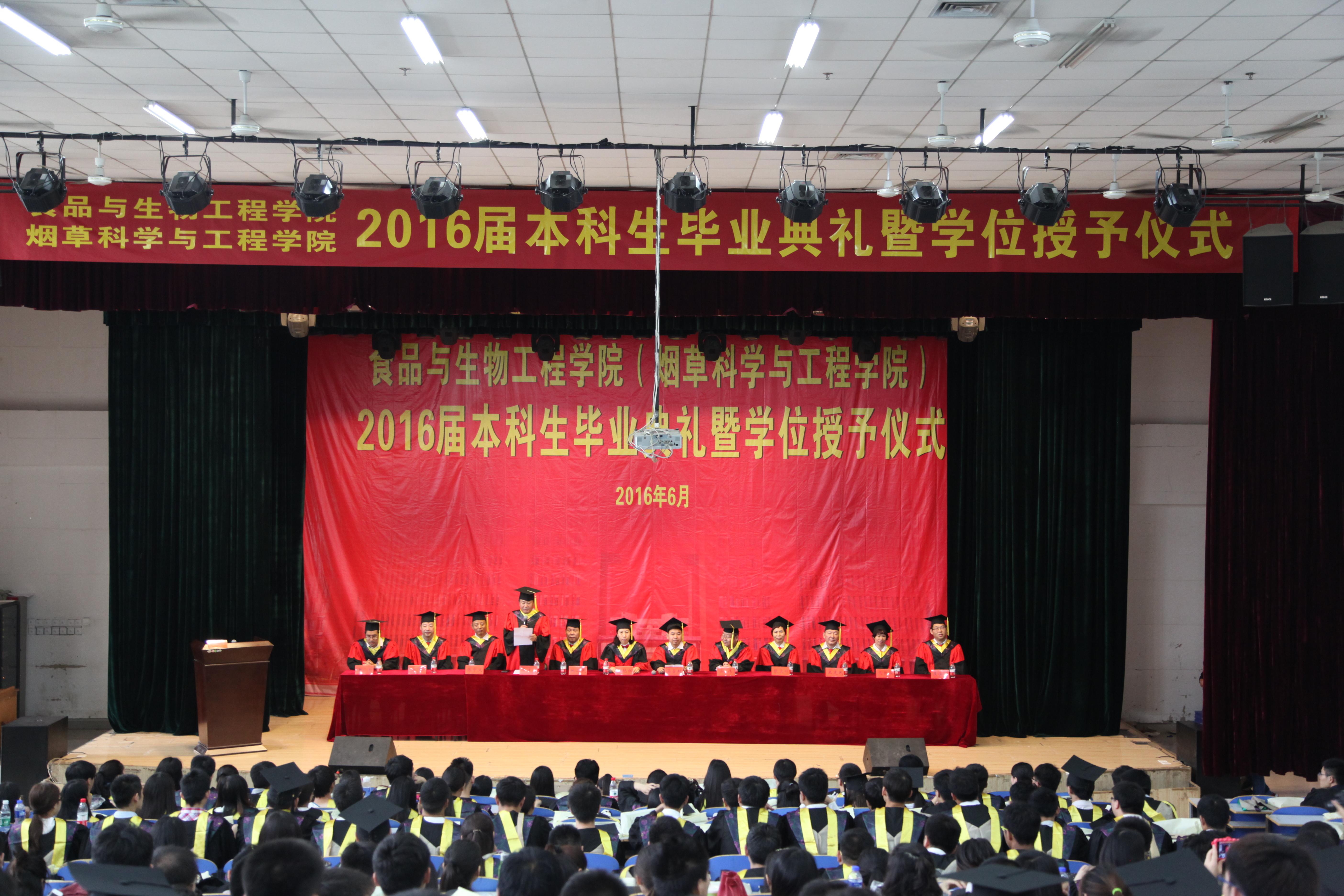 2016年6月7日上午10点,食品与生物工程学院(烟草科学与工程学院)在科学校区三教楼208召开2016届本科生毕业典礼暨学位授予仪式。学院领导班子、教师代表及2016届毕业生参加了此次仪式,仪式由副院长景建洲教授主持。