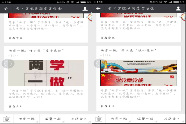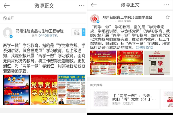 自开展“两学一做”学习教育活动以来,食工学院党总支紧紧围绕“两学一做”学习教育的内容,广泛开展各项宣传教育活动。通过制作宣传板、宣传栏、学院电子屏等加大宣传力度。通过学院官方微博,微信平台推送相关学习教育内容,加强教育引导,创建党员QQ群、各支部定期汇报学习情况,并开展线上讨论学习。学习教育氛围的营造和学习载体的多样化,有力地调动了全体党员深入学习并践行“两学一做”的积极性。