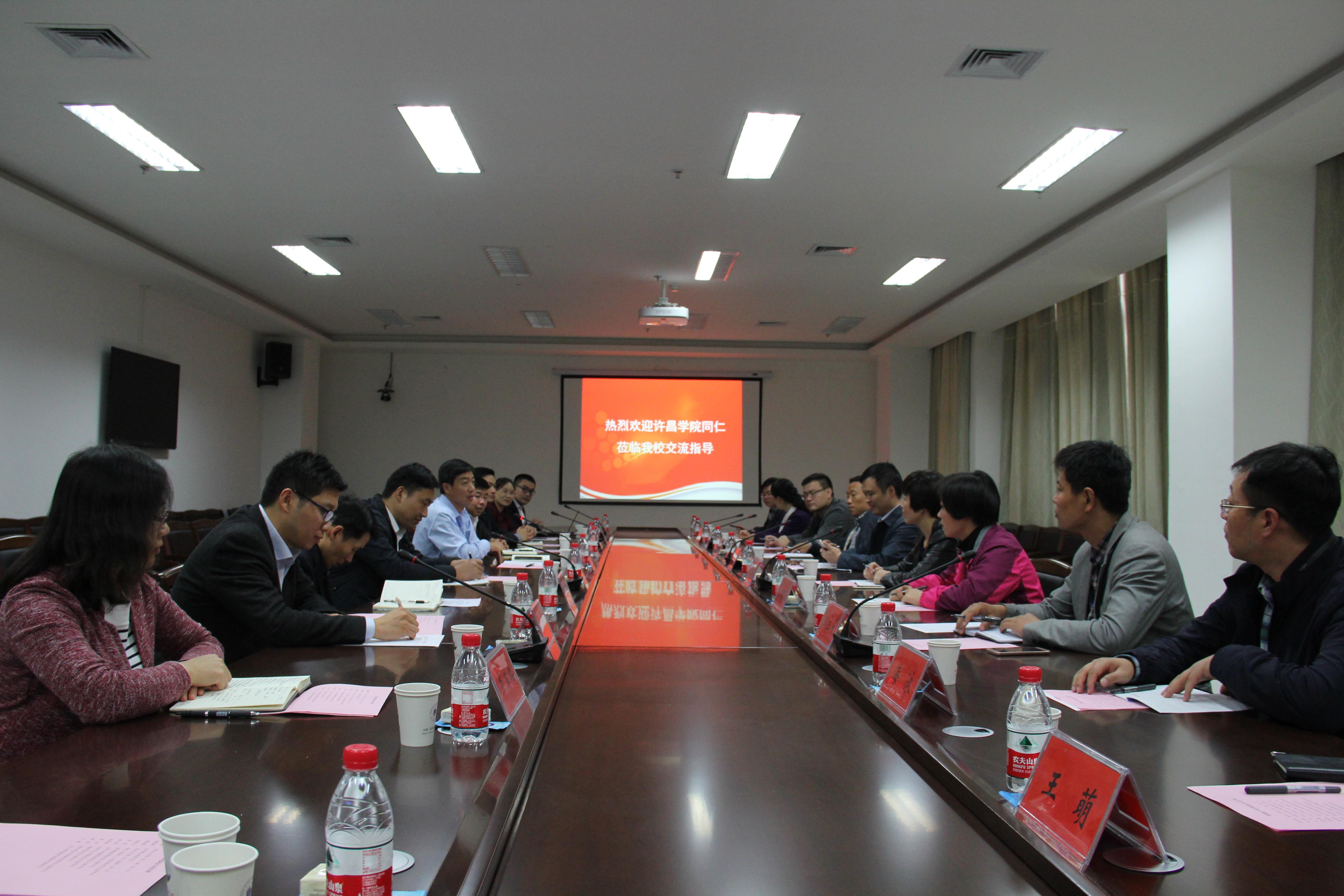 党委学工部部长、学生处处长张世涛主持会议。对许昌学院同仁的来访表示了热烈欢迎,简要介绍了我校的基本情况与良好的发展态势。他从坚持德育为首,创新工作模式,提高思想政治教育针对性和实效性;依法依规管理,加强学风建设,营造良好育人环境;坚持育人为本,强化服务意识,促进大学生全面成长成才;完善保障制度,增强责任使命,打造高水平学生工作队伍等四个方面总结了我校近年来学生工作情况,回顾了工作中取得的主要成效和具体做法。重点针对网络思想教育、奖助学金管理、学生文明行为养成等方面做了说明。会议还就学生工作体制机制、学生宿舍文化建设、学生事务管理服务和辅导员队伍建设等双方共同关心的问题进行了有益交流和探讨。