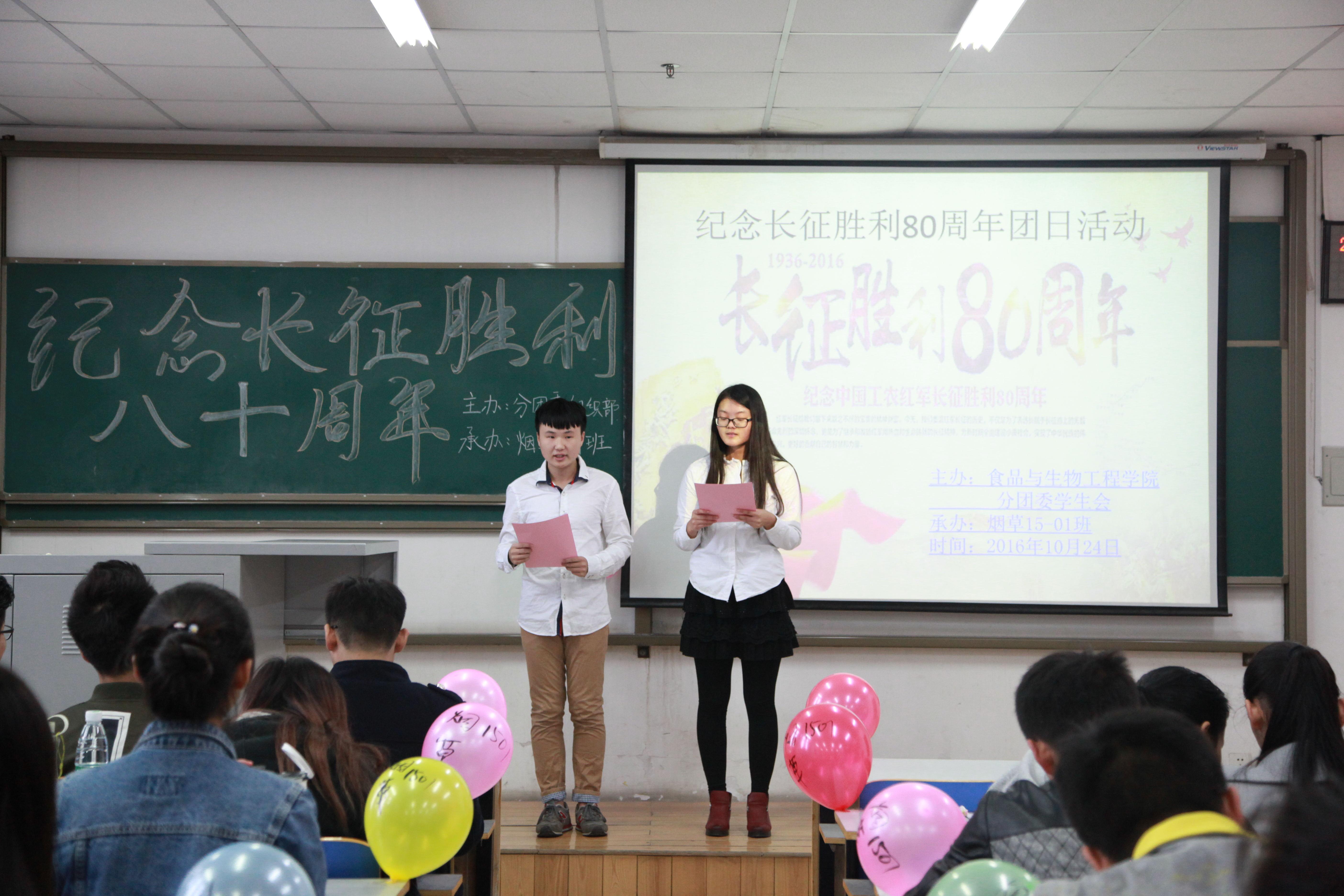 为纪念工农红军长征胜利80周年,弘扬红色传统,传承红色基因,展现红军战士英勇无畏勇往直前的英雄气概。食品与生物工程学院(烟草科学与工程学院)于20161026日中午在二教812举行了“纪念长征胜利80周年”主题团日活动。我院辅导员老师、各年级党员和团员代表参加了此次活动。