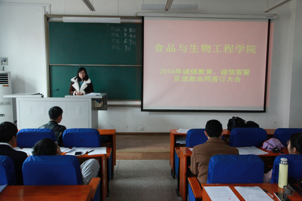 ,食品与生物工程学院在食工楼209教室举行了国家助学贷款合同签订暨诚信教育大会。学院学工办李燕老师、负责贷款工作的张书铭老师及全体贷款学生参加了此次会议。