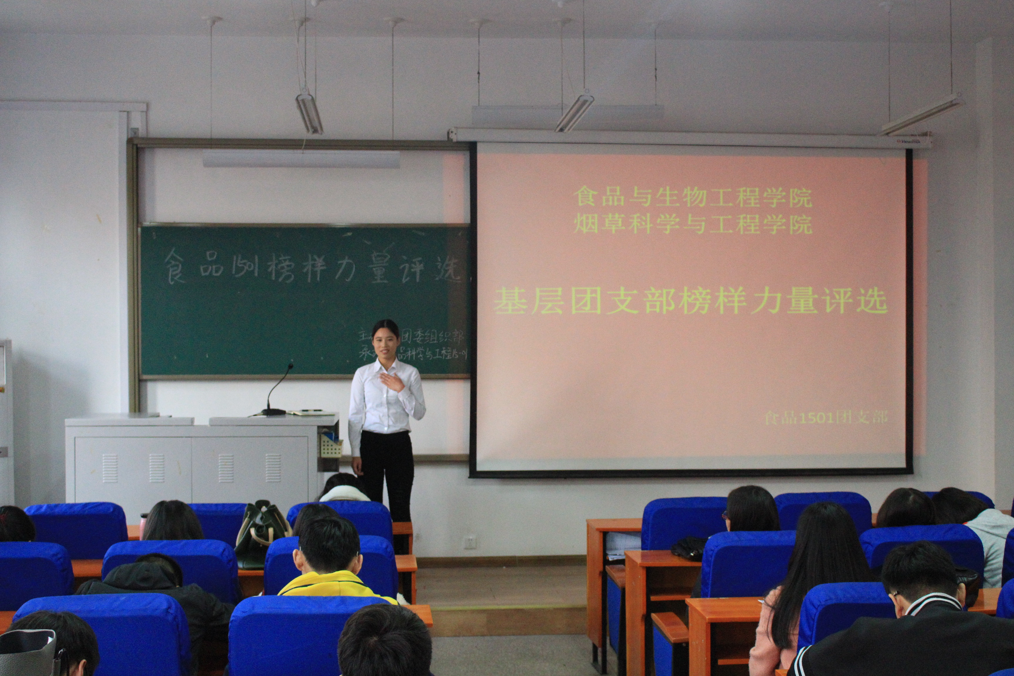 为进一步提升基层团支部活力,充分发挥身边的榜样力量,营造更加团结、进取的学习生活氛围,食品与生物工程学院(烟草科学与工程学院)于2016年11月8日在食工楼209召开了“轻院学子,榜样力量——基层团支部榜样力量推选”团日活动。我院分团委、学工办、专兼职辅导员、学业指导老师和基层团支部学生党员和团员参与了此次团日活动。
