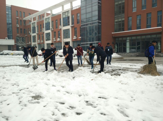 2016年立冬以来郑州的第一场大雪飘然而至,使大地万物银装素裹,令人不禁产生“瑞雪兆丰年”的美好憧憬,但道路上厚厚的积雪也为学校师生的出行带来了不便。为畅通交通,方便出行,
