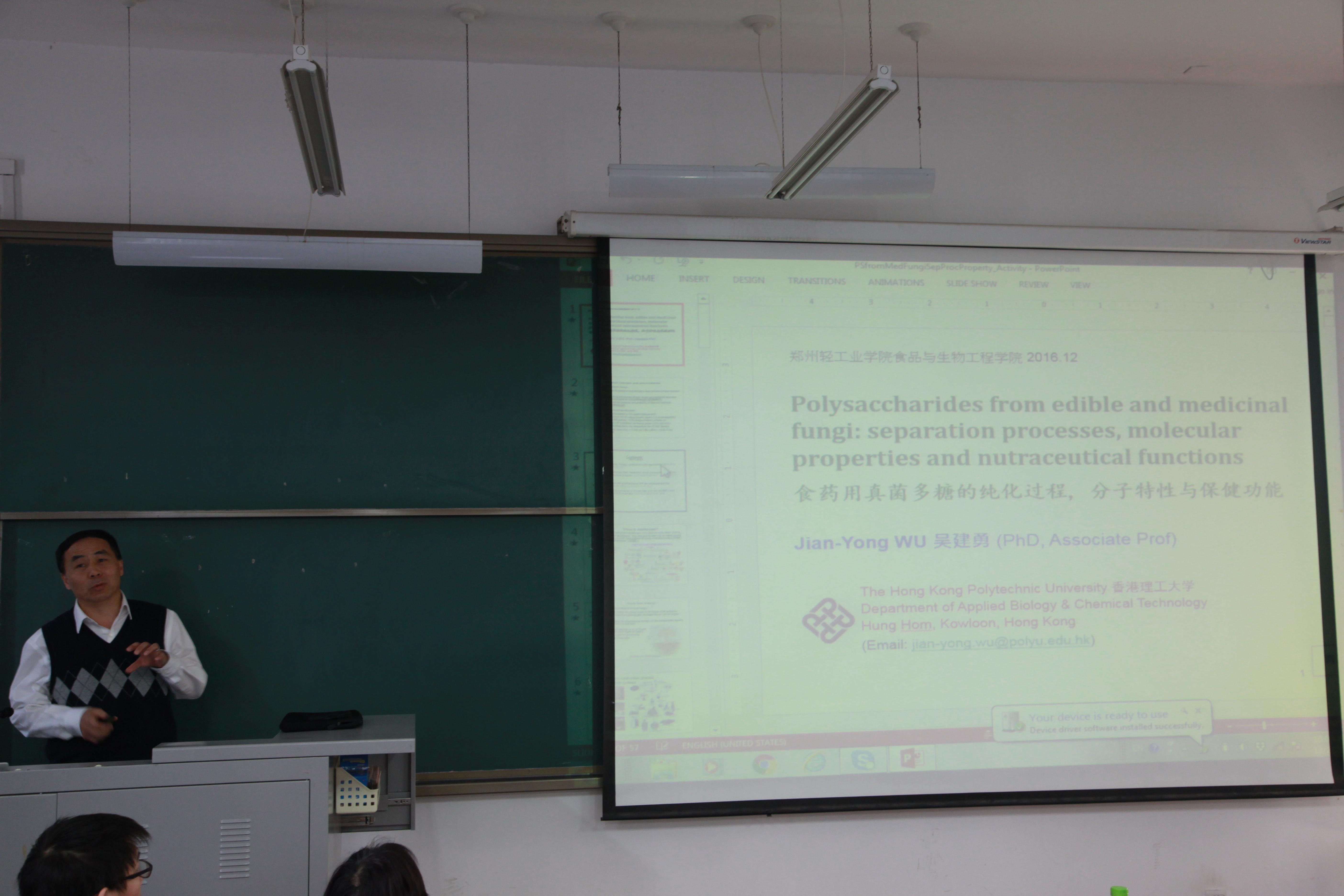 2016122日上午9:00,应我校食品与生物工程学院邀请,香港理工大学吴建勇副教授来校进行学术交流,为我校师生做了食药用真菌多糖:分离过程、分子特性及保健功能的学术报告。食品与生物工程学院教师、研究生和部分本科学生听取了报告。