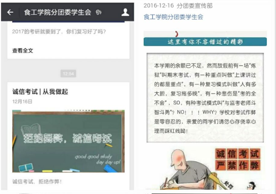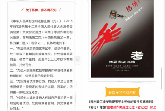 按照学院统一部署,各年级辅导员组织本班同学认真学习了最新颁布施行的《中华人民共和国刑法修正案(九)》(2015年11月1日施行)、《郑州轻工业学院学生违纪处分管理规定》和《郑州轻工业学院授予学士学位的暂行实施细则》(修订),强调细则中增加“因考试作弊受过记过(含记过)以上处分者”取消授予学士学位资格这一重要条款,让学生对考试纪律与违法处理规定有更全面、更准确的了解,教育学生高度重视考场纪律,不可投机取巧,切莫以身试法。鼓励学生合理制定复习计划,以良好的精神面貌和积极的心态迎接接下来的考试。此外,学院还通过宣传板、宣传条幅、微博、微信等方式进一步扩大考风考纪和诚信教育工作的覆盖面,并组织全体学生签署《食品与生物工程学院诚信考试承诺书》。学生们纷纷表示将会严格遵守学校、学院相关管理规定,用自己的实际行动践行“社会主义核心价值观”中对于个人诚信的具体要求。