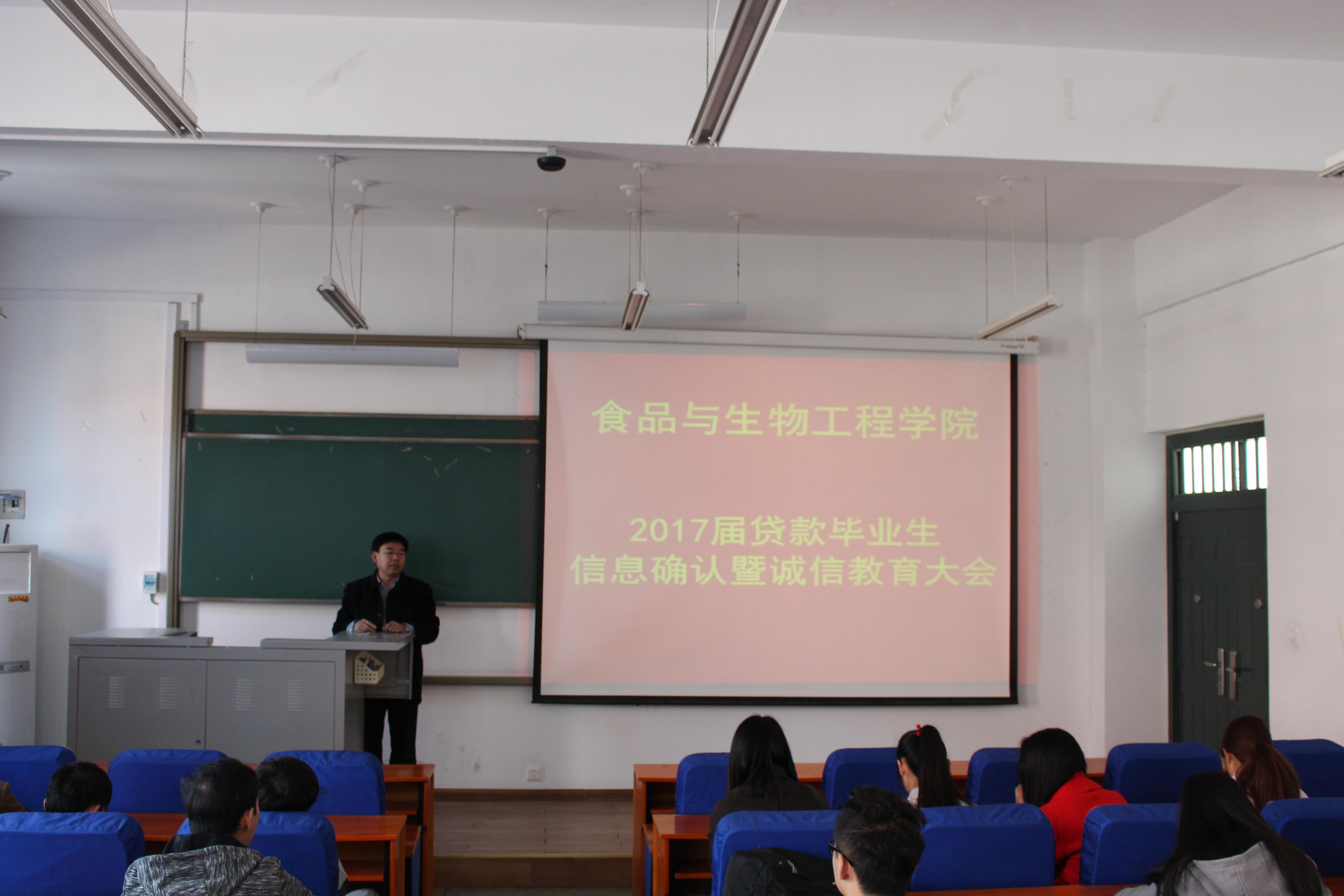 2017年2月24日中午1点,食品与生物工程学院(烟草科学与工程学院)在食工楼209教室召开2017届贷款毕业生信息确认暨诚信教育会议。学院党总支吴占超书记、13级辅导员及全体2017届贷款毕业生参加了此次会议。