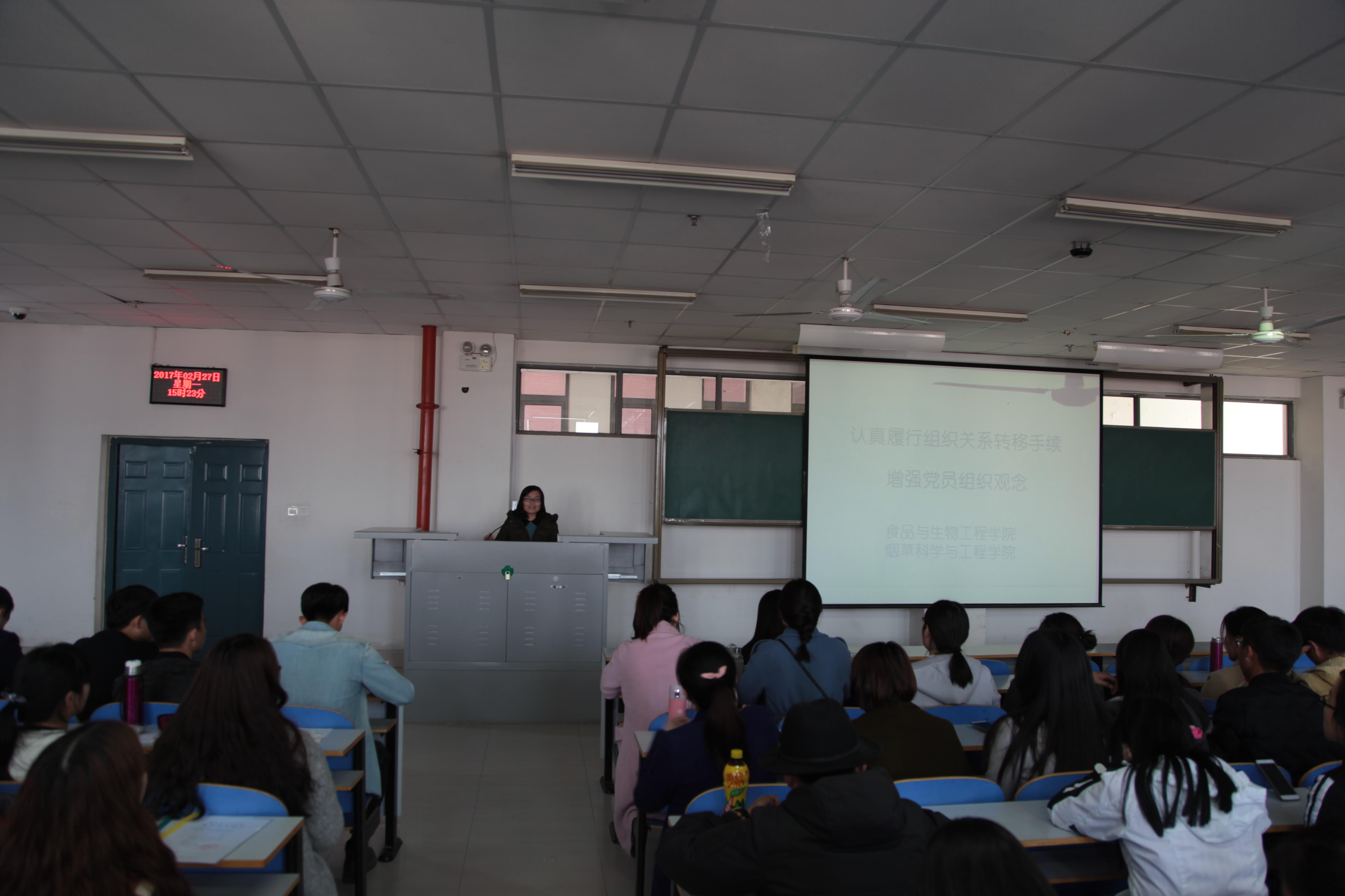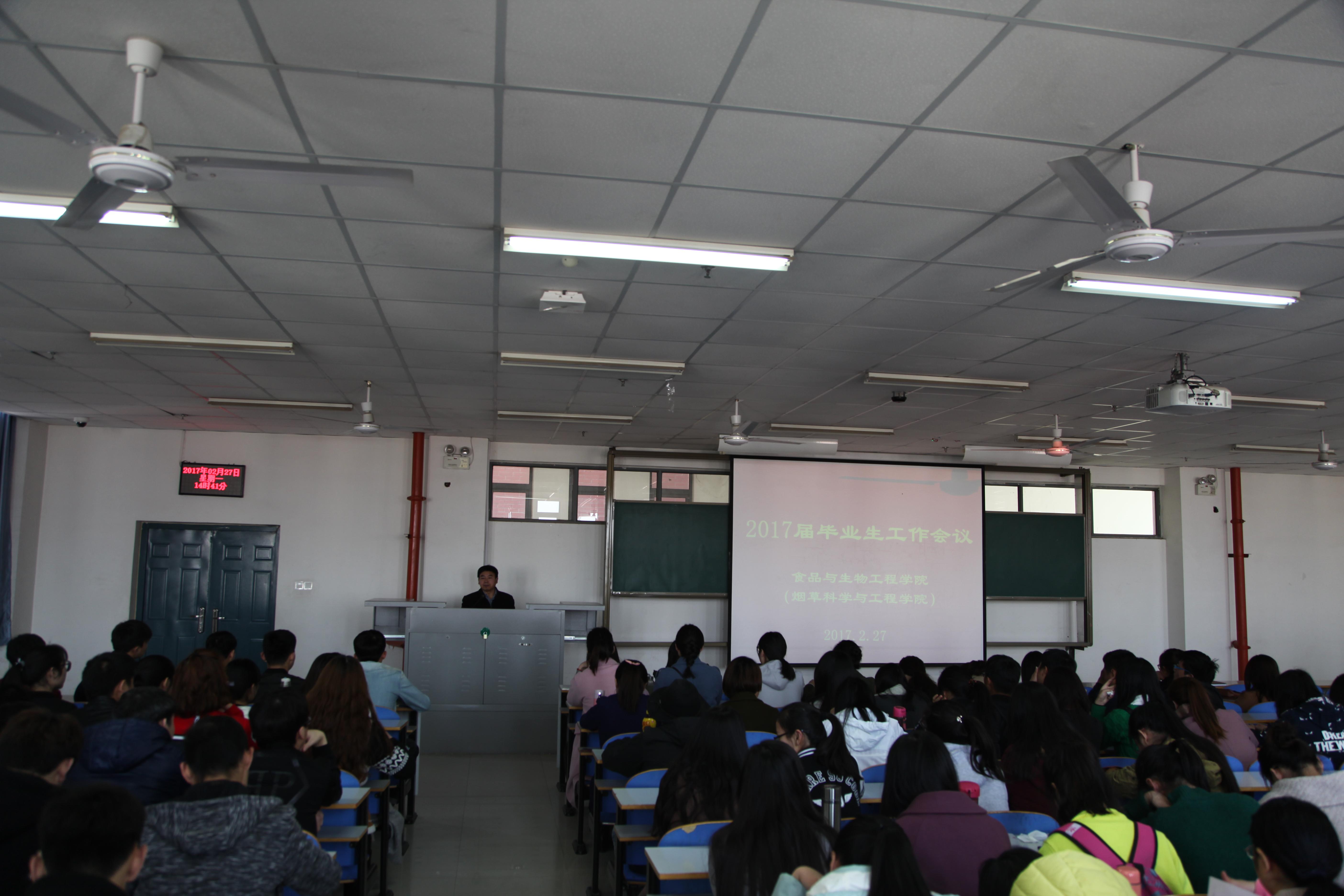 为切实做好我院2017届毕业生就业工作,加强对毕业班学生的服务、管理和安全教育,2017年2月27日下午2点30分,食品与生物工程学院(烟草科学与工程学院)在二教楼816教室分专业召开了2017届毕业生工作会议。党总支书记吴占超、辅导员李燕老师、张陆燕老师、张书铭老师以及全体2017届毕业生参加了此次会议。