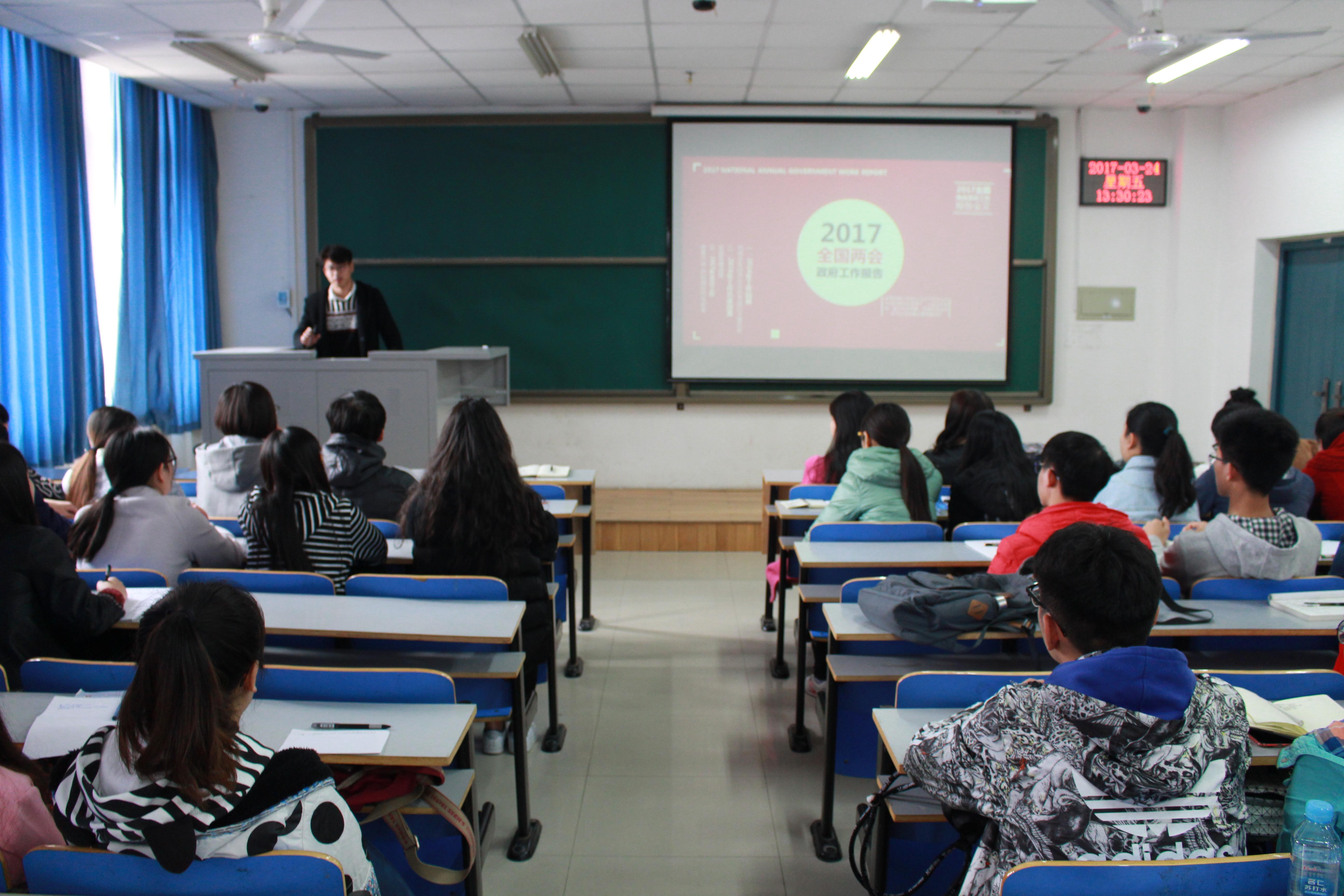 会上,李老师首先带领大家回顾了刚刚结束的全国两会,传达了习近平总书记在两会上的讲话精神,并就李克强总理作的政府工作报告相关内容进行了重点解读。随后,与会同学联系自身,围绕“大学生就业创业”、“脱贫攻坚”等大学生重点关注的话题发表了自己的看法。党员代表张垒上台分享了自己的学习心得,他表示,总理的政府工作报告让他深切感受到我国经济社会等各方面发展成就的来之不易,政府对于民生的关注、对教育的重视让他备受鼓舞,作为当代大学生,应明确自己肩负的历史和社会责任,主动关注国家时事,认清大局,振奋精神,勤奋钻研,刻苦学习,为建设和谐社会贡献自己的力量。