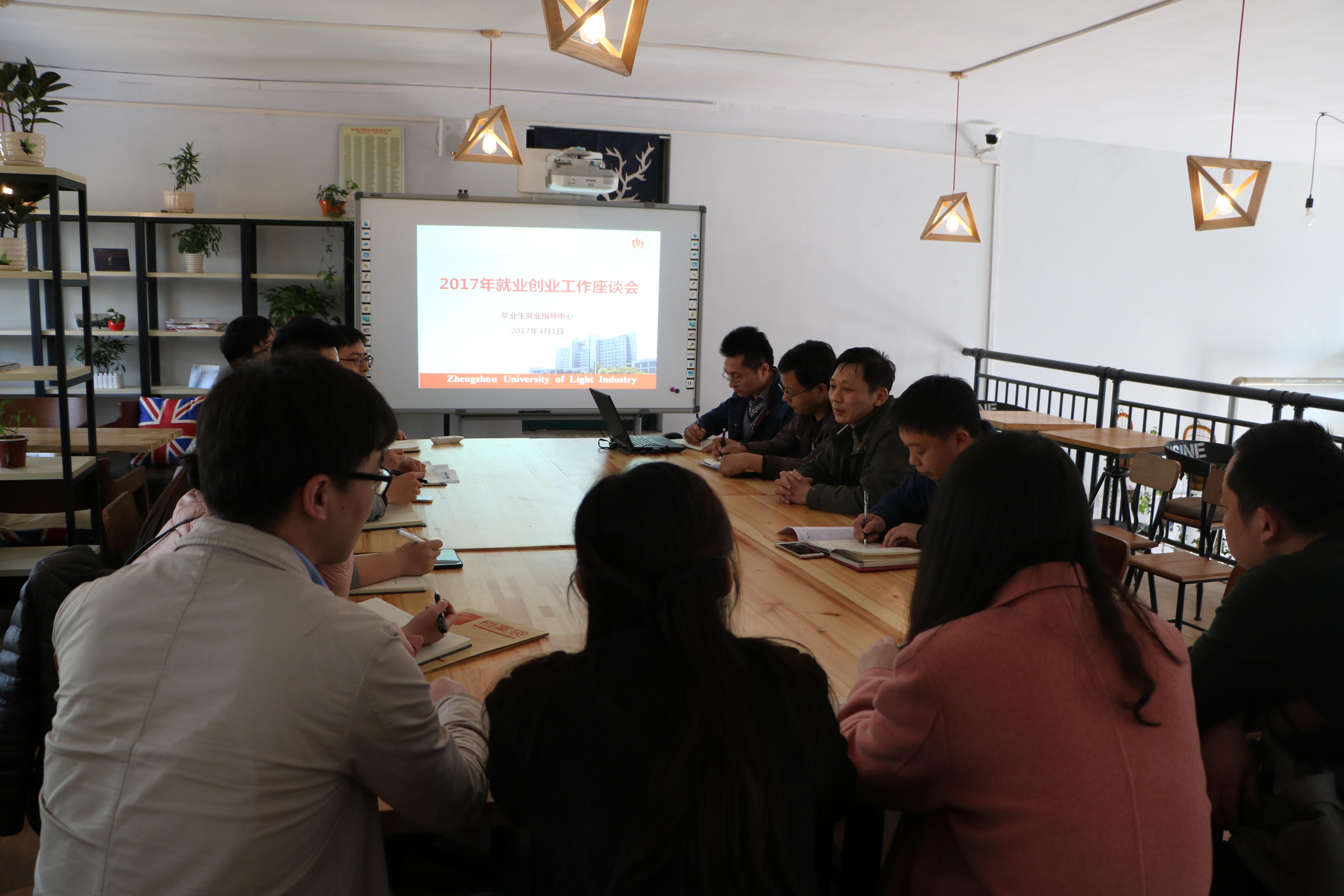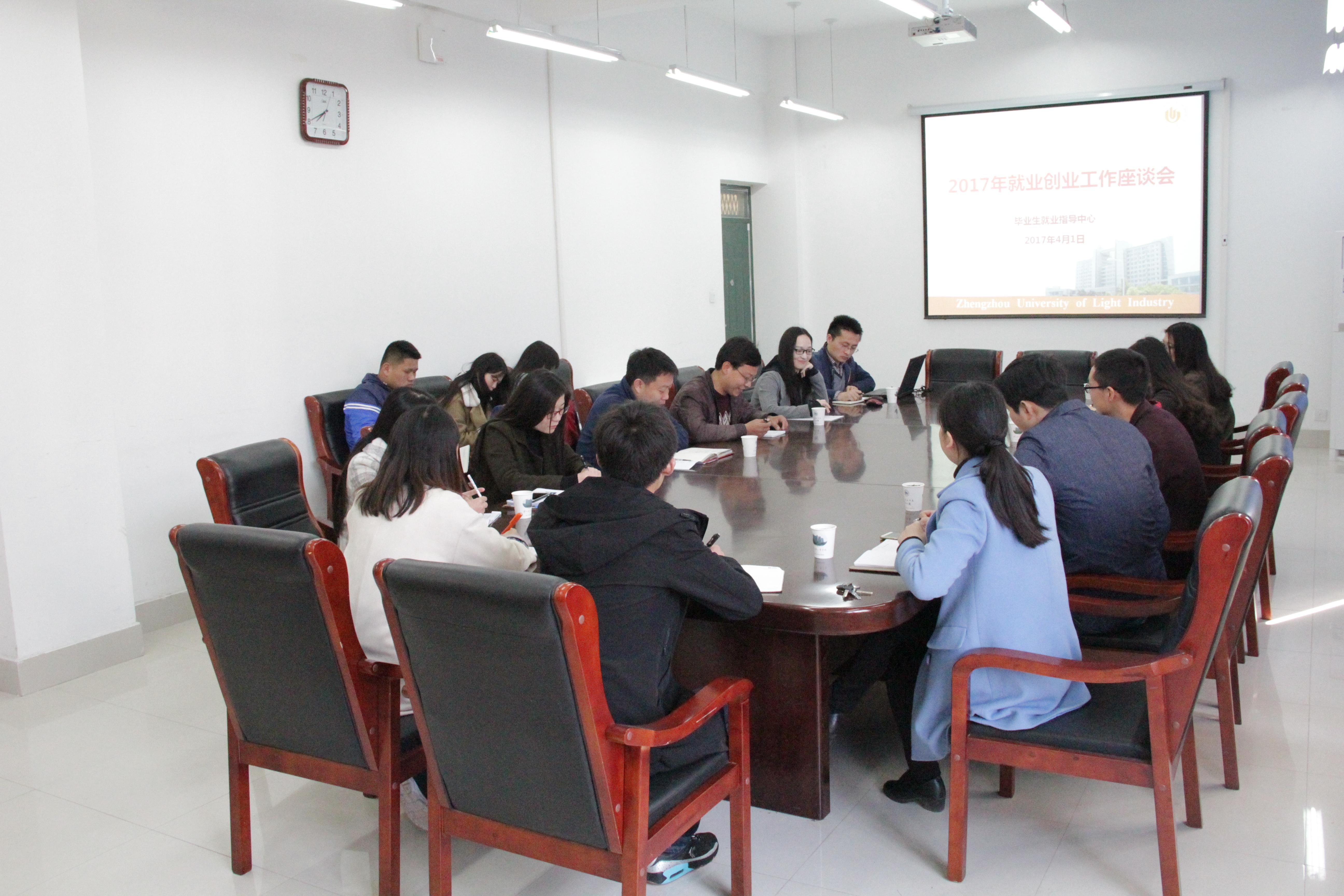 为进一步推进2017届毕业生就业创业工作,4月1日,毕业生就业指导中心分别在科学校区大学生活动中心楼207室、东风校区东四楼聚书吧组织召开就业创业工作座谈会。毕业生就业指导中心万顺国主任、各二级学院就业创业专职工作老师及毕业生就业指导中心全体人员参加了会议。