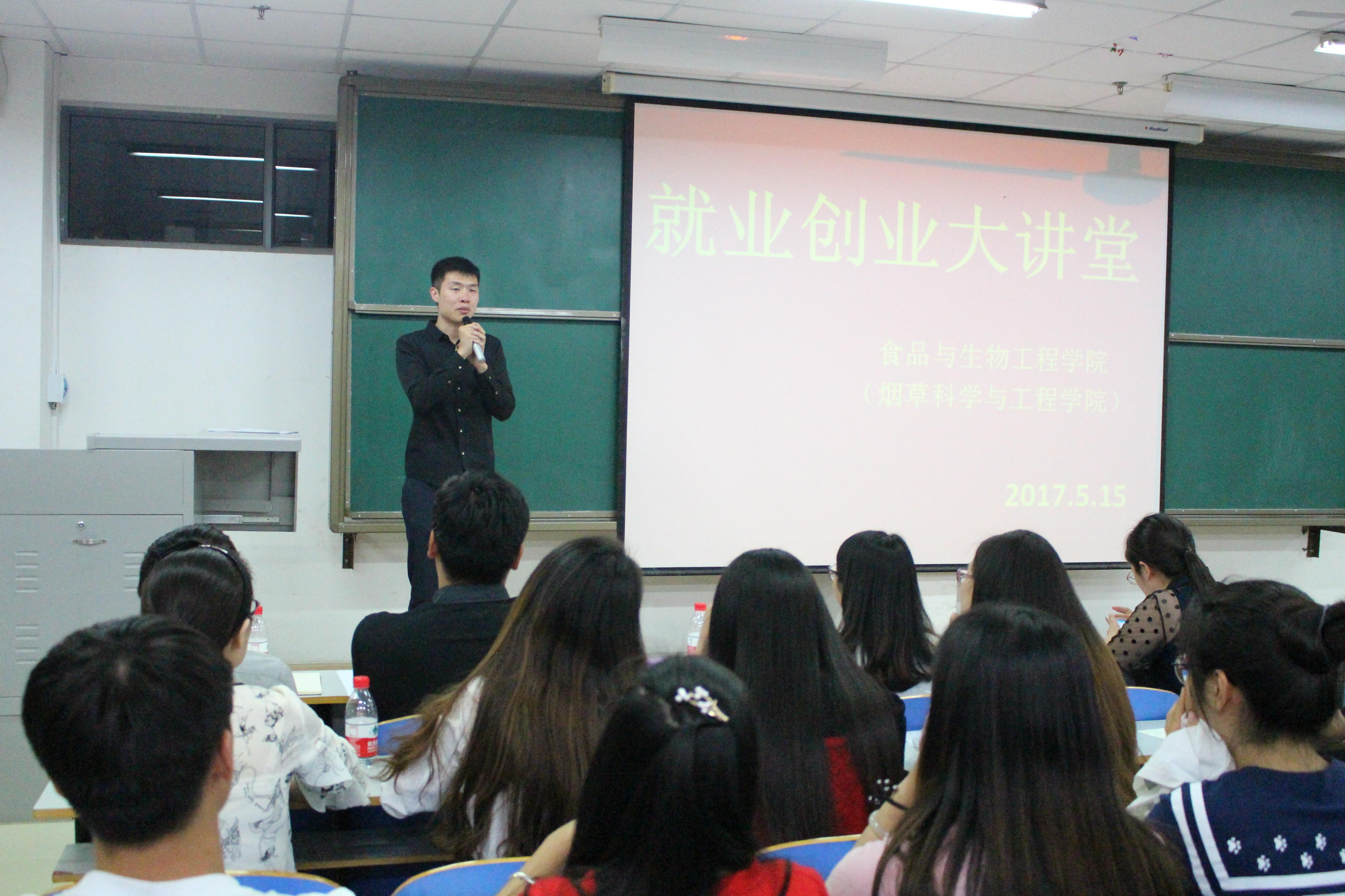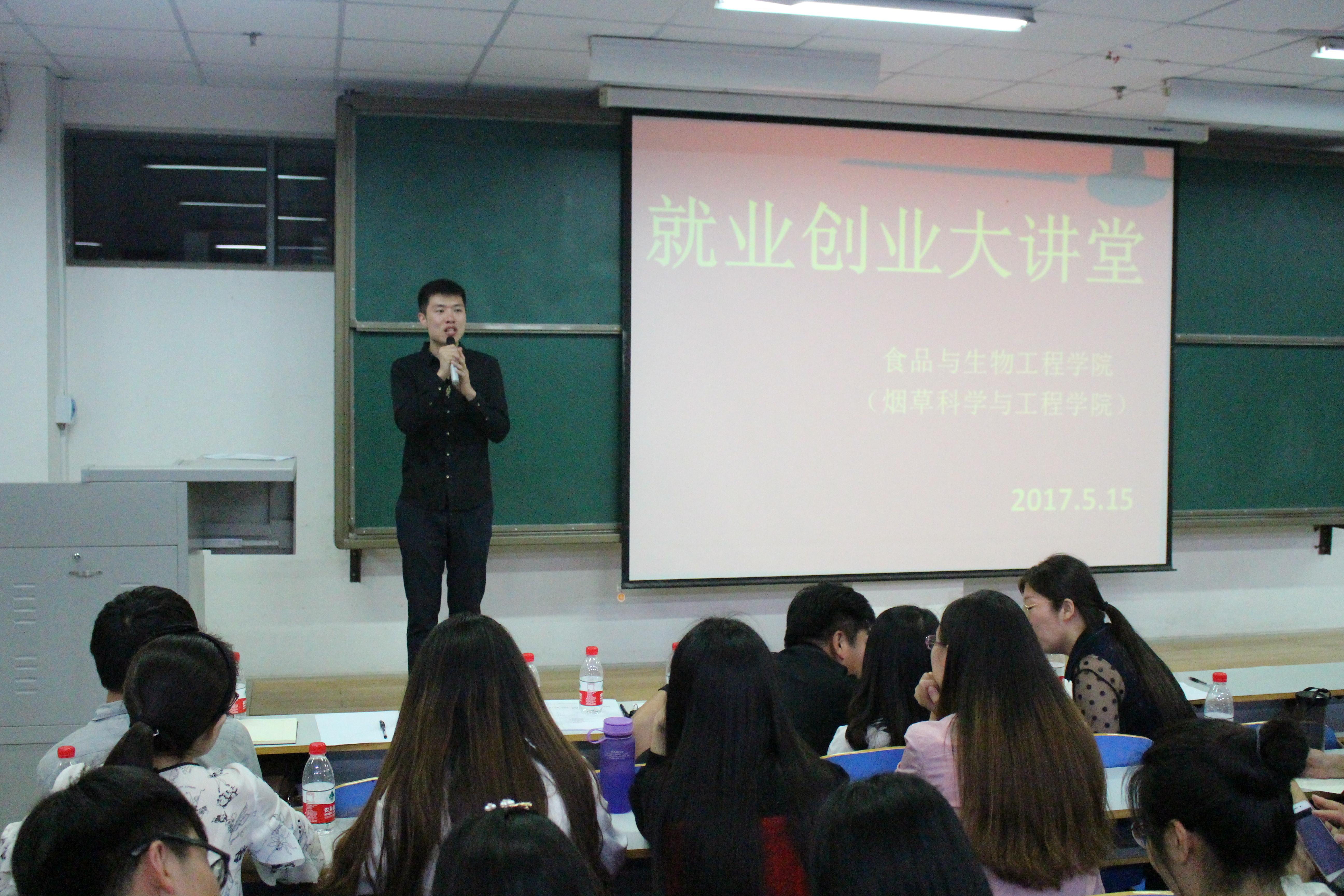 为了进一步增强大学生对当前创新创业环境的认识,培养创新创业意识,增强创新创业能力,2017年5月15日下午,食品与生物工程学院(烟草科学与工程学院)在科学校区二教楼816举办“大学生活与创新创业”就业创业大讲堂,讲座邀请阿里巴巴集团CEO聘任的全球梦想家、郑州大学创业联合会主席王旭主讲。