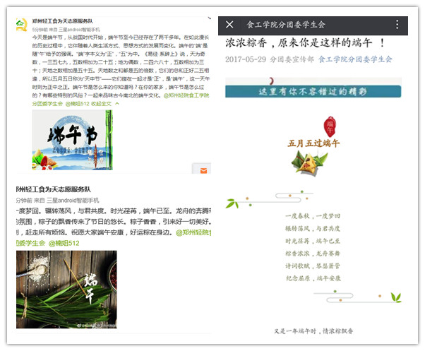 此次活动通过多媒体课堂、科学小实验、知识展板、宣传彩页等丰富多彩的形式展开。志愿者们将宣传板摆放在教室走廊,让孩子们系统地了解我国传统节日文化及食品安全知识。活动伊始,带队老师王楠向小学老师和孩子们简单介绍了我校“食为天”志愿服务队,并讲述了端午节的由来以及端午节承载的文化情感和家国情怀。接着,志愿者结合PPT进行了声情并茂的演讲,并向小朋友们展示了科学小实验,指导小朋友观察培养皿中微生物的形态,一起分享微生物世界的神奇,进一步提高了小朋友们对我国传统节日文化及食品安全的认识。最后,志愿者和小朋友们一起参与了“动动智慧小手,品品端午粽子”的粽子制作比赛,大家纷纷提出自己的创意,自己动手,乐此不疲。小朋友们热情高涨,积极参与到互动游戏中,在游戏中学习传统节日文化。此外,我院还通过微信微博等微平台推送端午节的相关知识,让同学们在浓浓的节日氛围中感受中华传统文化的深刻精神内涵。