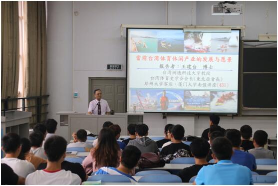 9月26日上午,受体育学院邀请,台湾著名体育学者、高雄树德科技大学运动管理系专任教授王建台博士前来郑州轻工业学院,以“当前台湾体育休闲产业的发展与愿景”为题,在教三楼200为我校师生作了一场精彩生动的专题讲座。