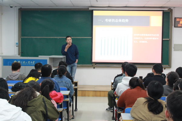 为增进同学们对考研的了解,帮助学生明确个人奋斗目标,增强考研信心,提升考研动力,2019年4月2日,食品与生物工程学院(烟草科学与工程学院)在活动中心208室和二教812室举办了考研动员指导会。我院副院长刘延奇、食品系教师相启森博士、烟草系教师贺远博士、生物系教师张志平博士、毕业班辅导员马瑞静及2016级全体学生参加了此次活动。