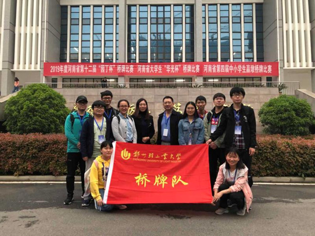 河南省2019年度大学生“华光杯”桥牌比赛于4月19日至21日在郑州财经学院举行。我校由王健林老师担任教练,在全校学生中选拔队员组队参加了本次赛事。经过三天激烈角逐,我校代表队斩获了:公开(男子)团体第四名,公开双人南北向第二名(付豪、韩朝阳)和东西向第四名(李泽源、许启明);女子双人东西向第六名(华毅彩、钱园),女子团体第七名。我校代表队同时荣获本次比赛的体育道德风尚奖。