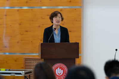| 外国语学院党总支副书记孔祥娟和经济管理学院辅导员、分团委书记姚少华分别作为先进单位和先进个人代表做经验交流发言 |