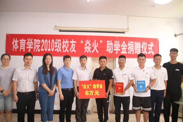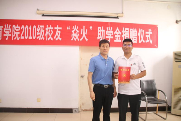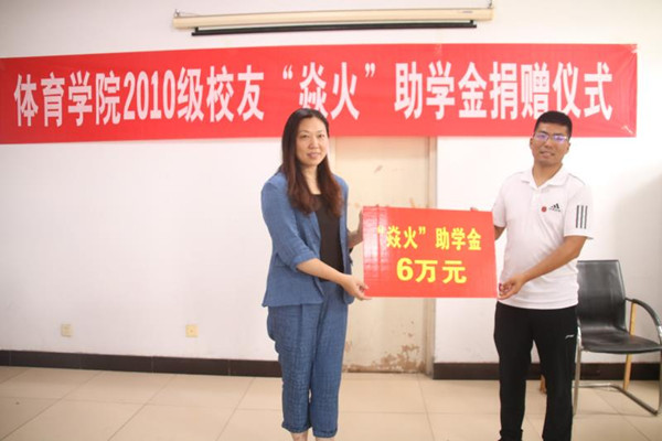 为帮助更多品学兼优、家庭经济困难的学生顺利完成学业,以此鼓励更多的大学生励志成才、报效祖国,体育学院2014届校友单长春在我院捐资6万元人民币设立“焱火”助学金,此项助学金将用于资助考入我校体育学院的家庭困难的大一新生。