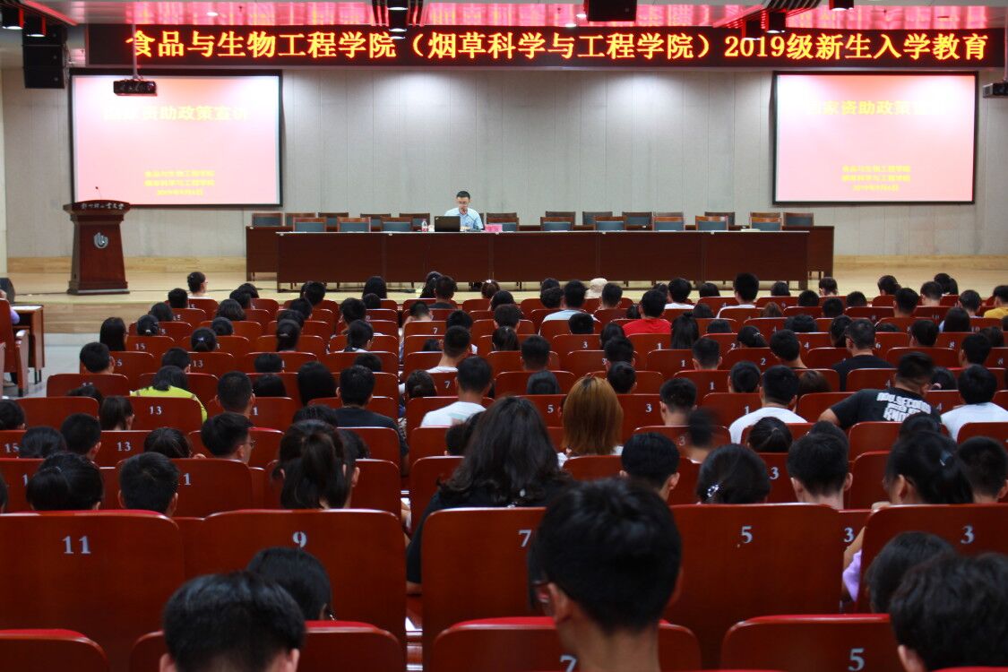 为更好的宣传国家资助政策,进一步落实资助政策宣传“两节课”制度,食品与生物工程学院(烟草科学与工程学院)分别于2019年9月6日、9日上午十点半在科学校区图书馆报告厅及活动中心208开展了新生资助政策宣讲会,会议由我院负责资助工作的李皓老师主讲,2019级新生辅导员张陆燕老师、何春雨老师及全体新生参加了会议。