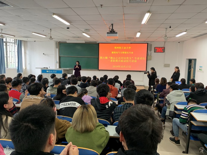 20191017日下午,我校建筑环境工程学院在科学校区三教楼104教室举办了建筑电气与智能化专业他山之石可以攻玉专业论坛第31期,邀请该专业长期合作企业——天友建筑设计有限公司郑州分公司副总经理兼人力资源总经理樊超女士,为该专业2016级毕业生做“求职面试与技巧分享”讲座。讲座由建筑电气与智能化系副主任武东辉主持,天友建筑设计有限公司天津总部及郑州分公司人力资源负责人、建筑环境工程学院副院长曹祥红、建筑电气与智能化专业部分教师参加。