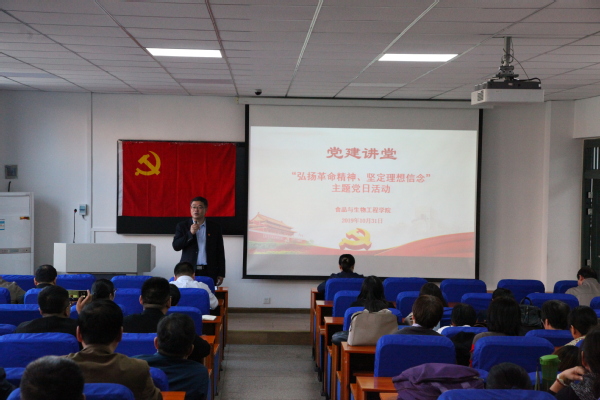 为扎实推进“不忘初心、牢记使命”主题教育,提升教育效果,2019年10月31日,食品与生物工程学院党总支在食工楼209开展“党建讲堂”主题党日活动,活动以“弘扬革命精神、坚定理想信念”为主题。学院班子成员,全体教工党员参加了本次活动,毛多斌副校长对活动进行了现场指导。