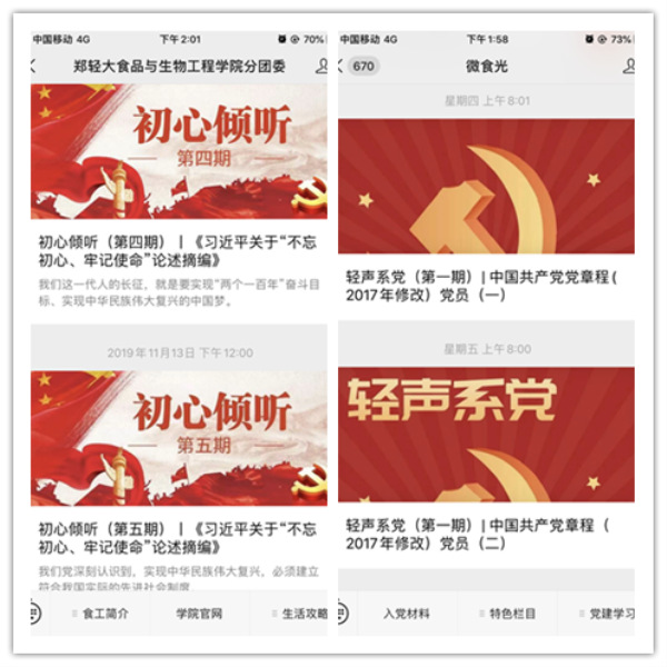 为深入推进“不忘初心,牢记使命”主题教育活动,进一步创新大学生思想政治教育工作的方式,食品与生物工程学院创新性开展网上思政课学习教育活动,探索推出了“初心倾听”、“轻声系党”学习教育载体,编印了系列学习手册。